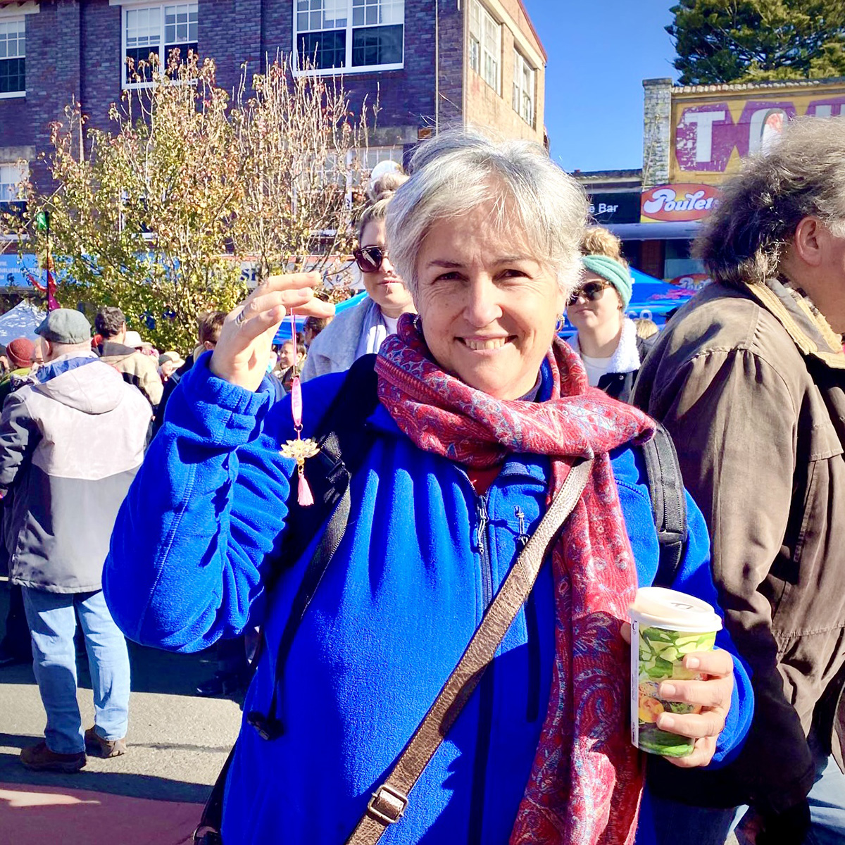 ![]() 图7:观众朱莉女士(Julie)手持印着“真、善、忍”字样的小莲花,她赞赏法轮功学员带给人们美好的信息。 |