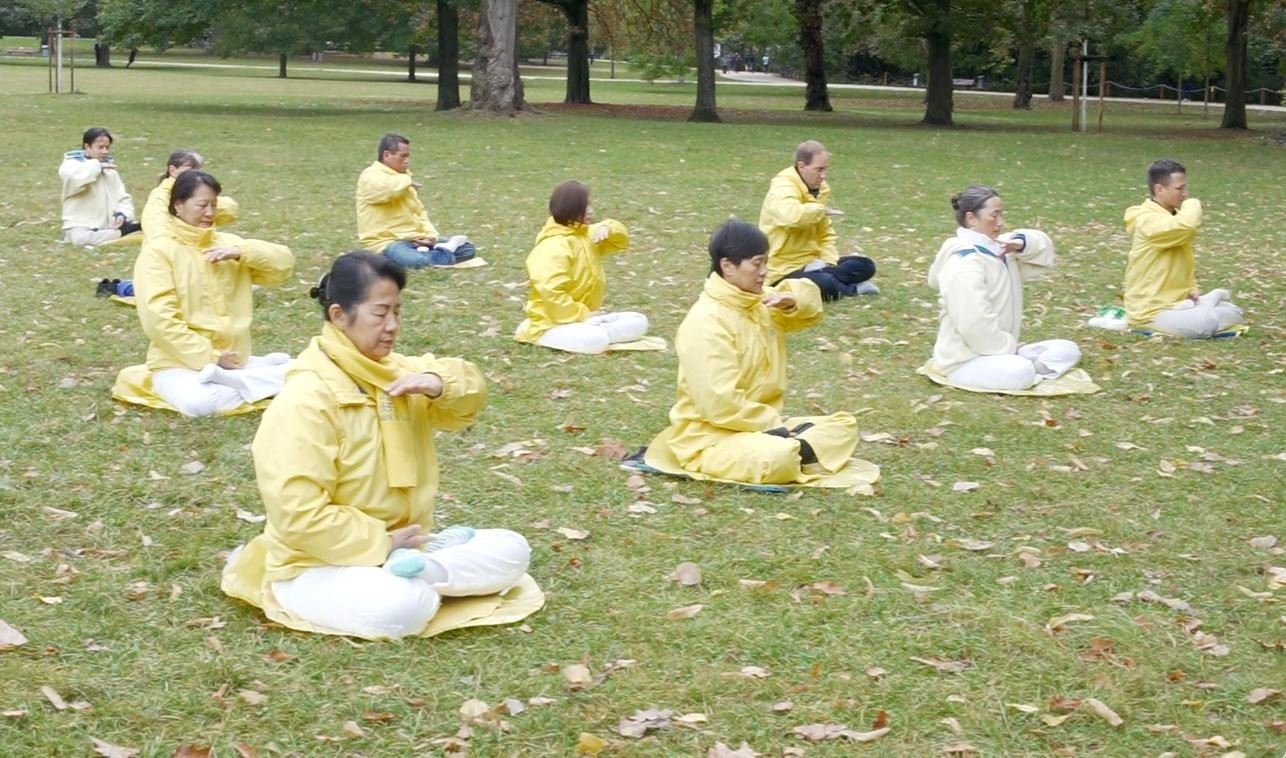 后来,学功的人多了,大家就筹划一起在户外炼功,于是选定了位于市中心的绿堡公园(Grüneburg park)作为炼功点。居住在美因茨(Mainz),威斯巴登 (Wiesbaden)和海德堡(Heidelberg)等周边城市的学员也都来参加炼功和集体学法。