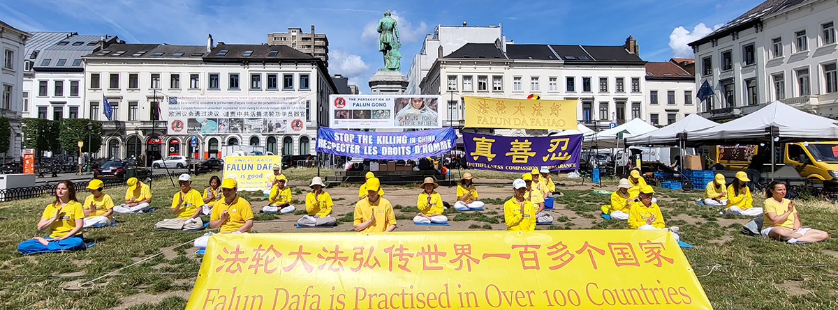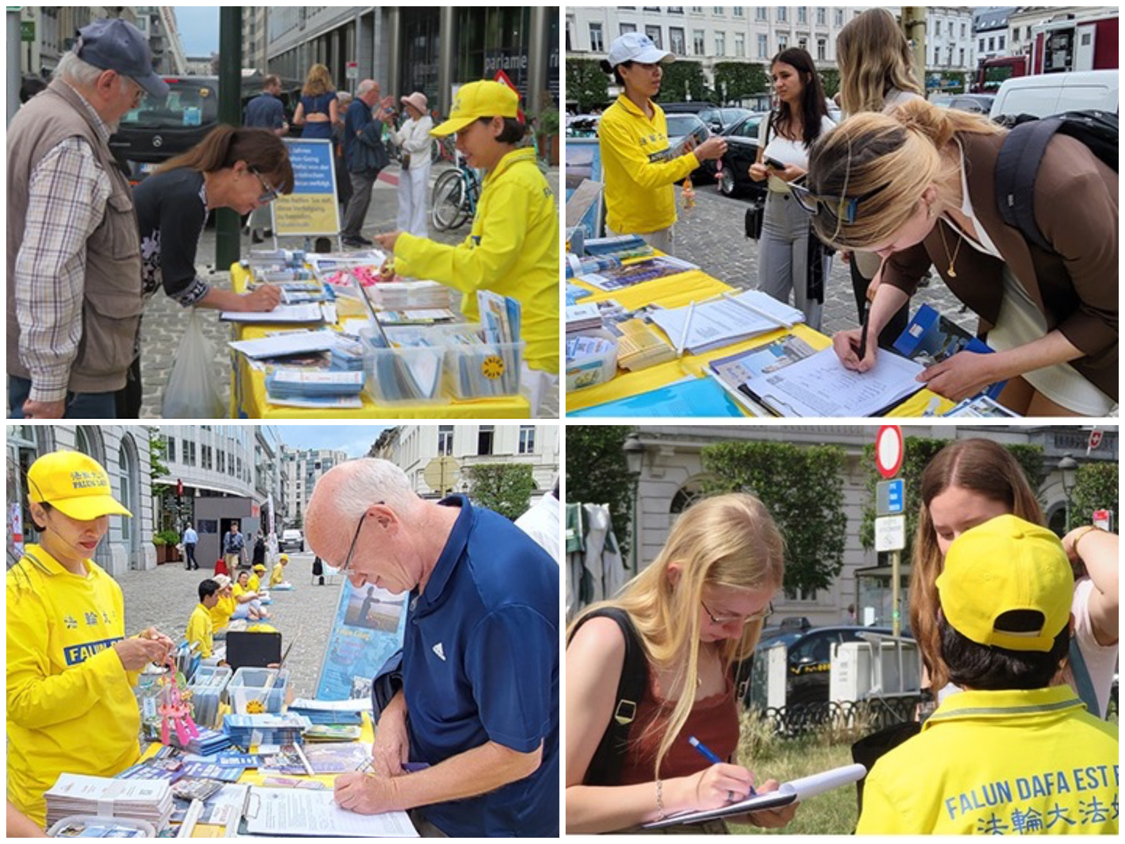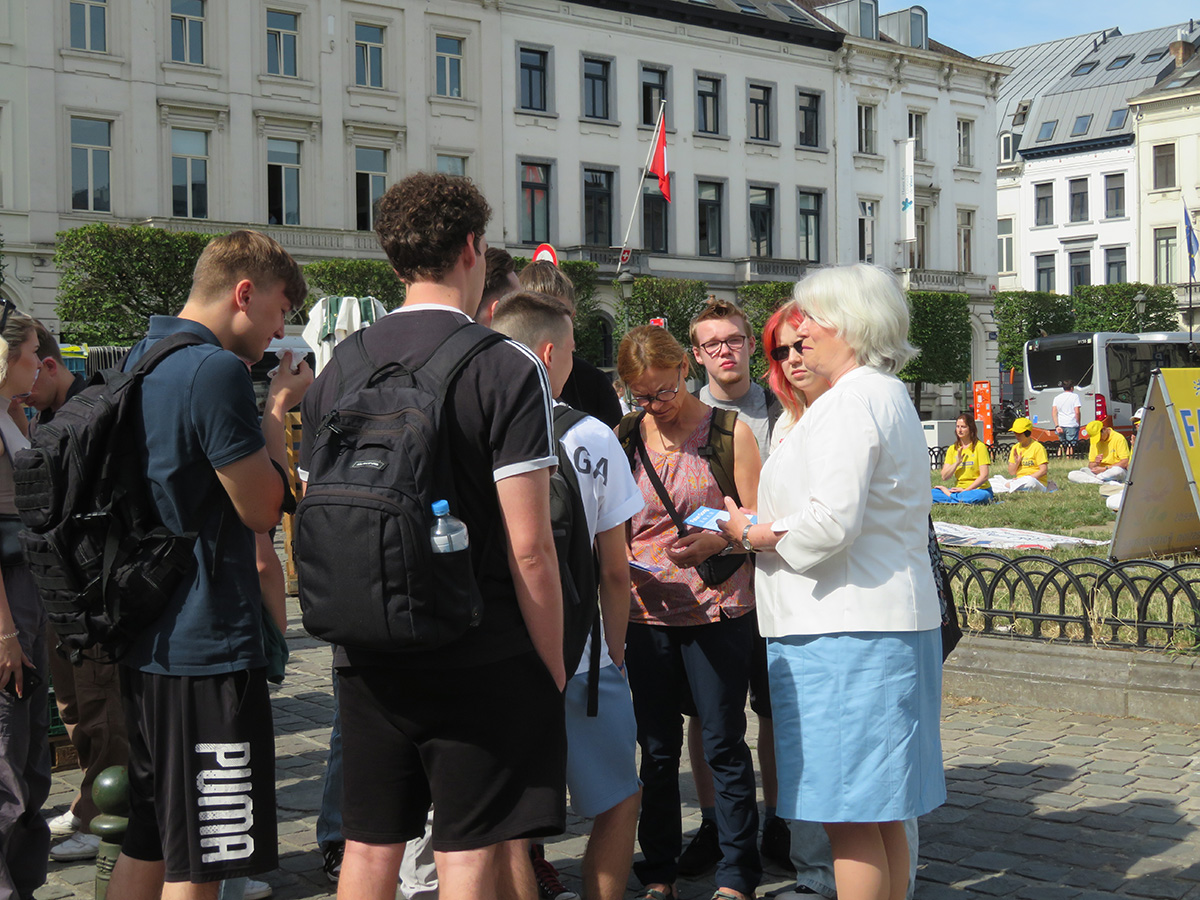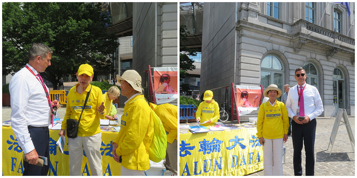 欧洲议会前来来往往的人们,包括那些工作在欧洲议会的工作人员,都在注视着穿着黄色T恤的法轮功学员安详的炼功场面,和他们展示的法轮大法好以及中共残酷迫害法轮功的图片及说明。特别是欧洲议会曾经通过反对中共迫害法轮功的决议案的横幅,让许多人震撼和感动,纷纷表达对中共迫害的反对和对法轮功学员的支持。
