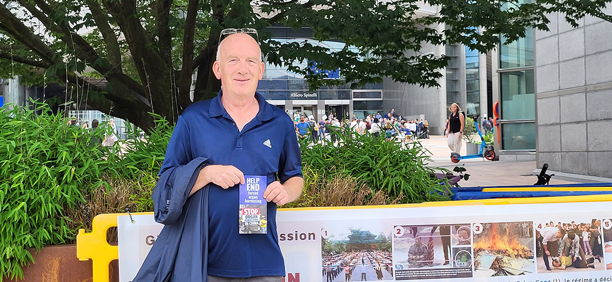 苏格兰人大卫(David)两个月前刚退休,因为还有工作交接事宜来欧洲议会办事。他在活动场地拍照,和学员交谈逗留了许久。他告诉学员因为工作的关系他一直关心政治和社会正义方面的事情,所以他听说法轮功,也听说过中共迫害法轮功的情况。