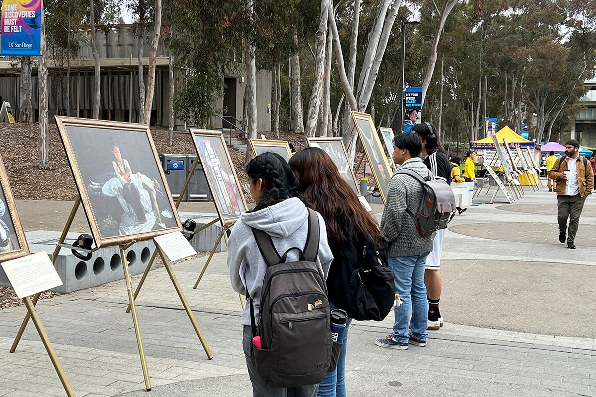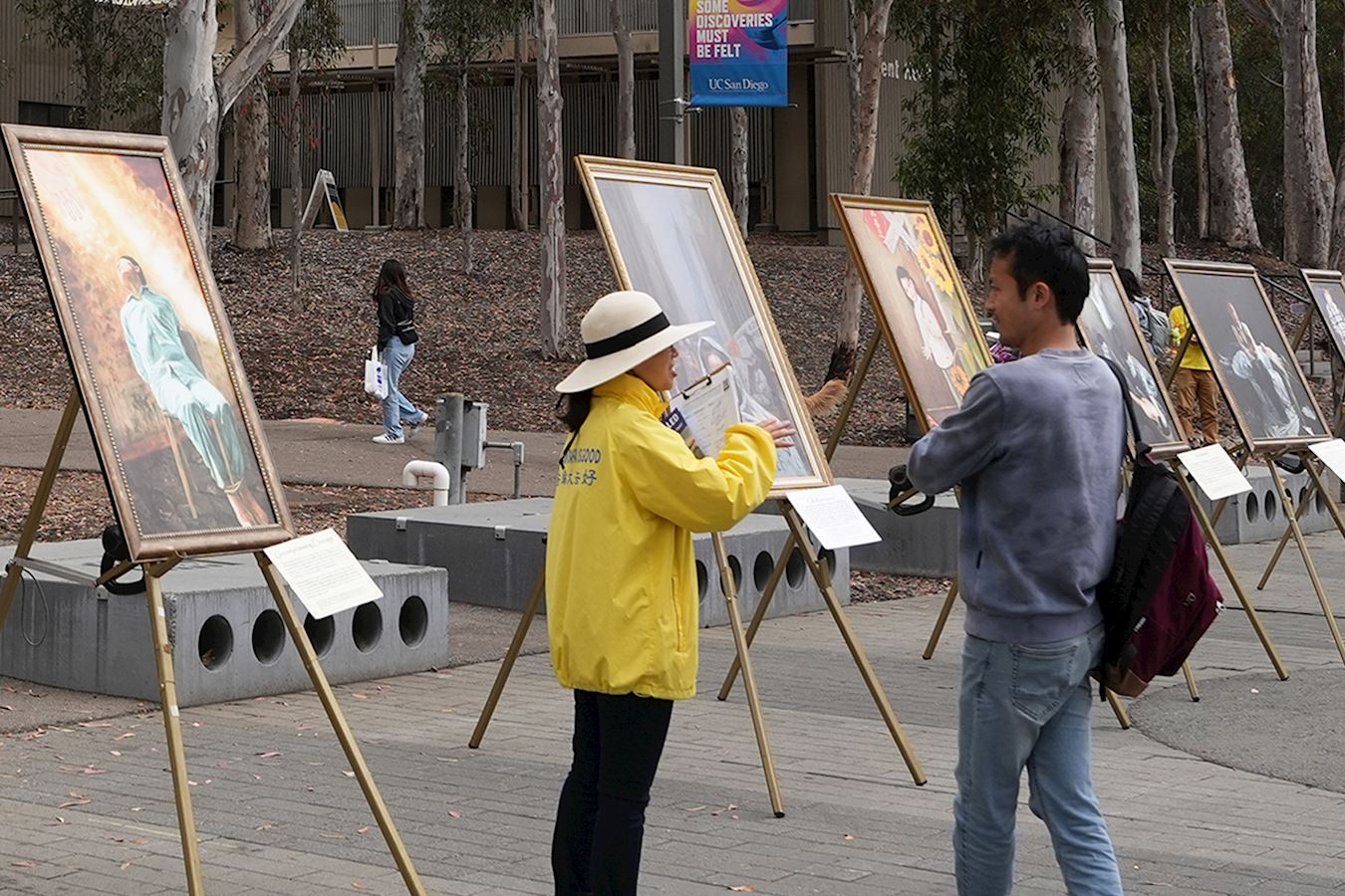 加州大学圣地亚哥分校(UCSD)法轮大法俱乐部的学生和部分当地法轮功学员们一起,在校园摆出真善忍真相的主题画展。课间休息的学生经过画展时,不少人驻足观看,并和法轮功学员深入交谈。
