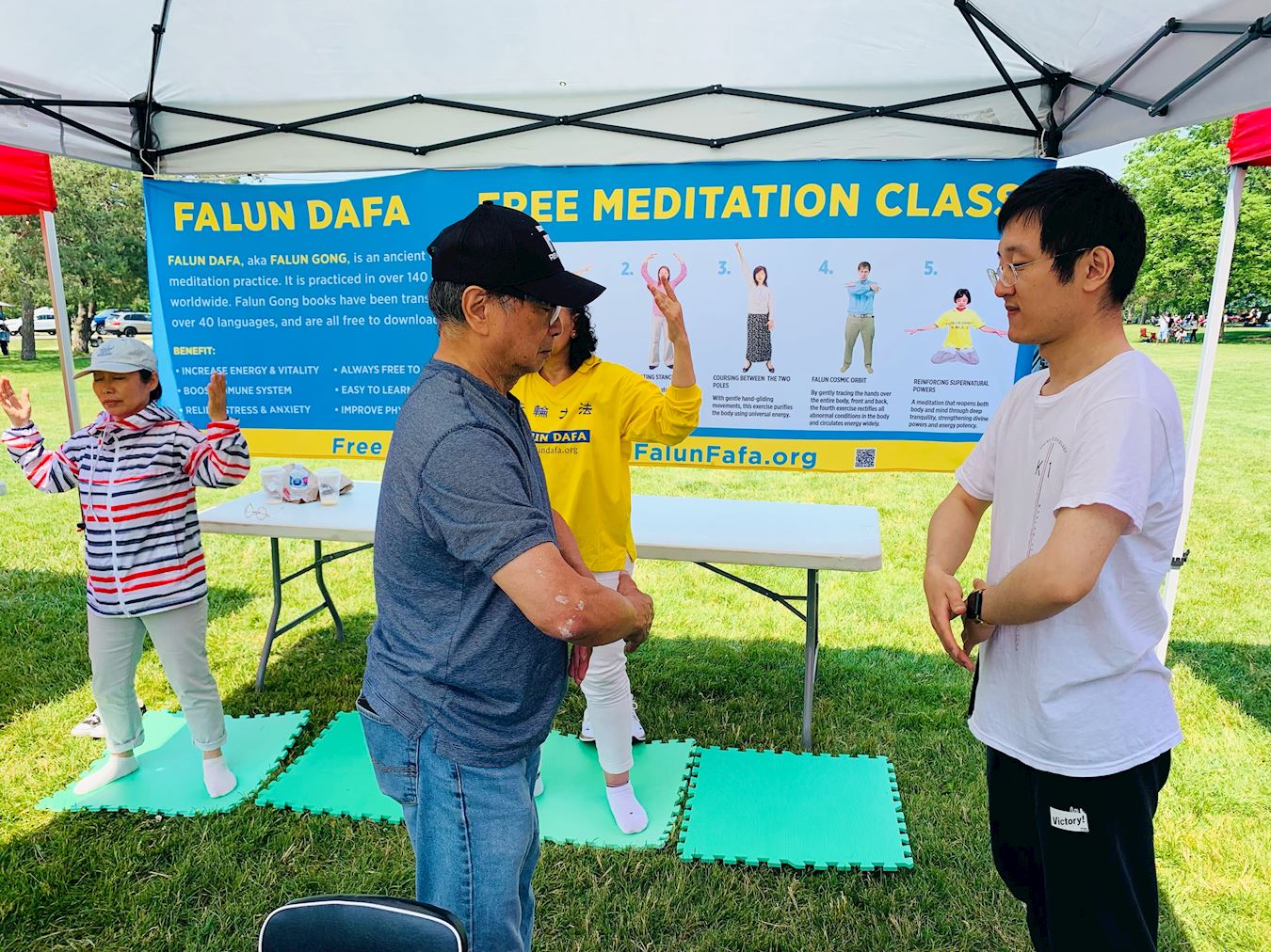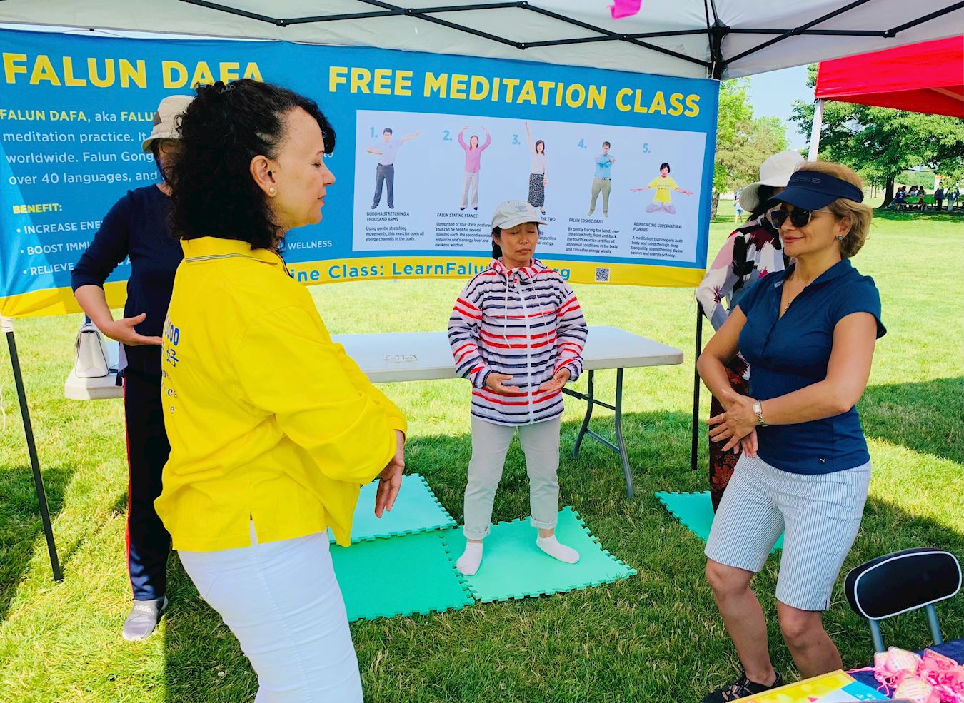 纳赞宁(Nazanin)来自伊朗,她曾经在尼亚加拉大瀑布旅游时,接到过法轮大法的传单。这次碰到了法轮大法的展位,她决定要来学功。非常巧合的是,这次在展位教她功法动作的又是一位同样来自伊朗的法轮功学员,她们用都熟悉的母语互相交流。
