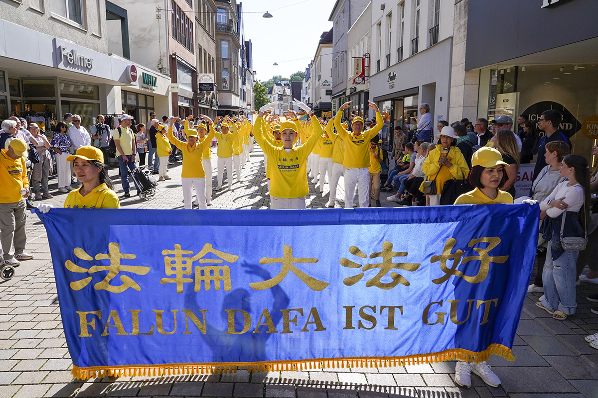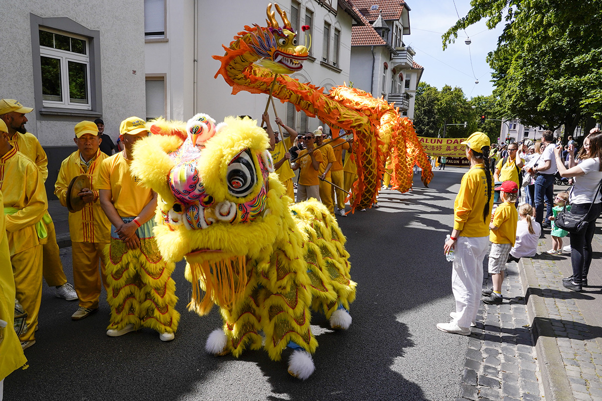来自欧洲各国的法轮功学员以天国乐团开道参加游行,之后是炼功方阵、舞狮队、舞龙队和腰鼓队,横幅队伍穿插在各个方阵之间。文化节的游行路线横穿比勒费尔德的市中心,在游行途中,学员们向民众分发了有真、善、忍字样的小莲花,并向人们讲述大法的美好。