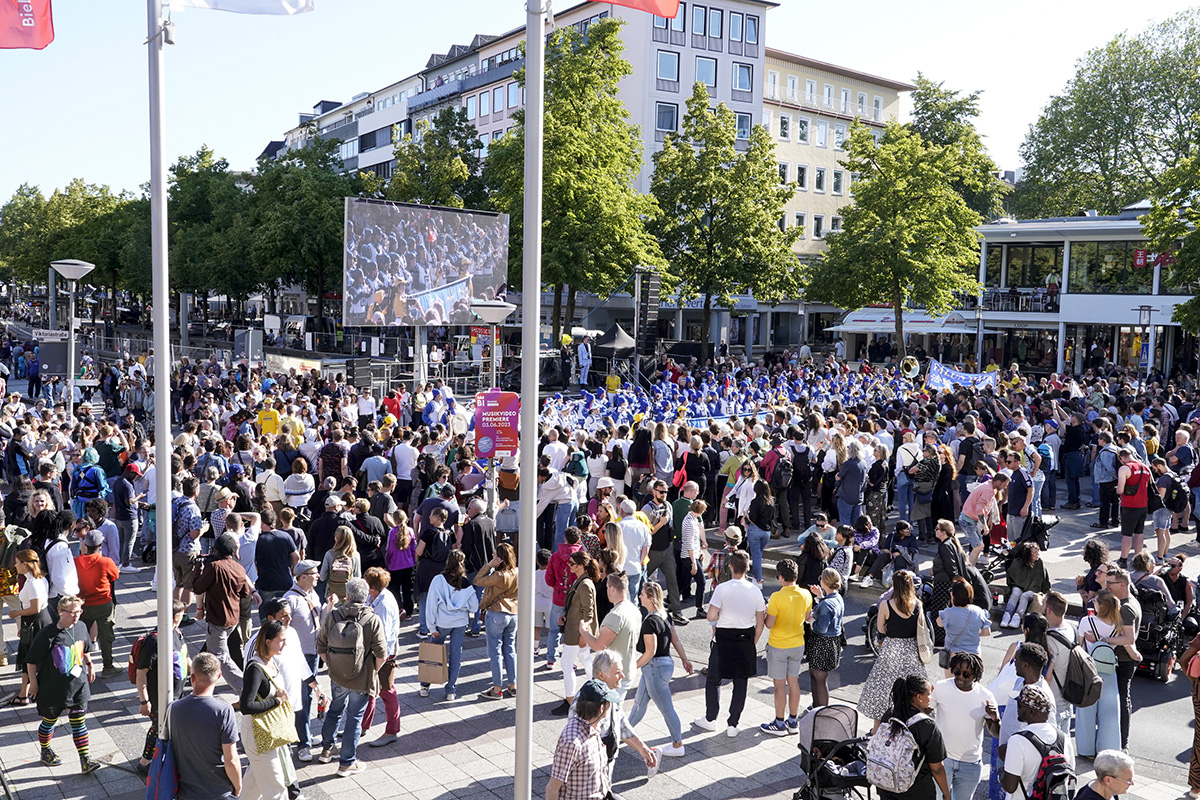 ![]() 图6:法轮功学员的游行队伍来到比勒费尔德的市政厅广场,人们站在屏幕前,观看法轮功学员的游行队伍入场的盛况。 |