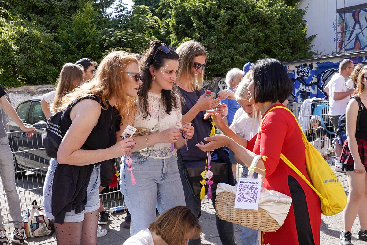 这是在二零二三年六月三日,法轮功学员参加德国比勒费尔德市第二十五届嘉年华(Bielefelder Carnival der Kulturen)的景象。在来自欧洲各地的团体中,法轮功学员的游行队伍受到民众的欢迎。