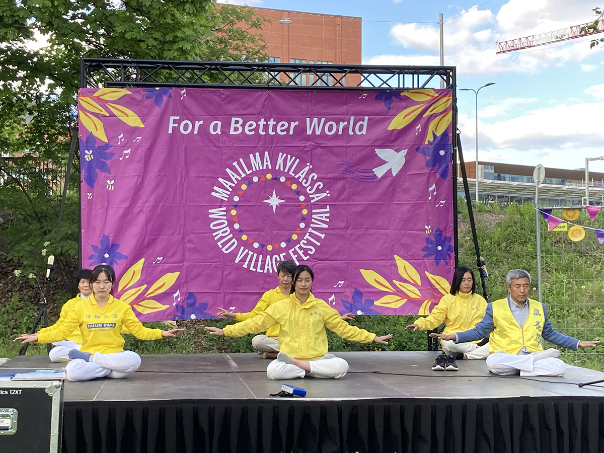 同时,法轮功学员还有机会在“街头艺术舞台”上展示法轮功功法。舞台横幅上写着“为了更美好的世界”,与穿着黄色衣服、炼着缓慢圆功法的学员的场景,让人耳目一新,现场的观众也跟着学起来。