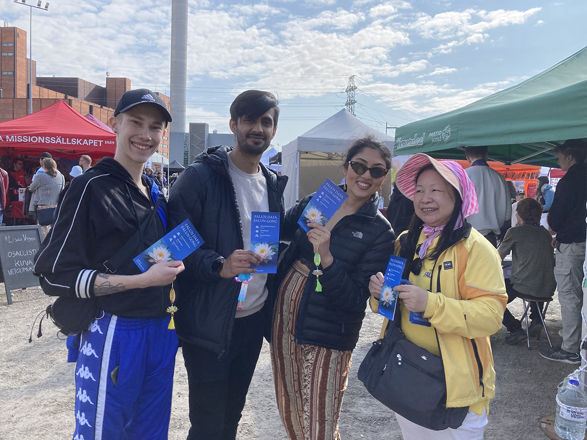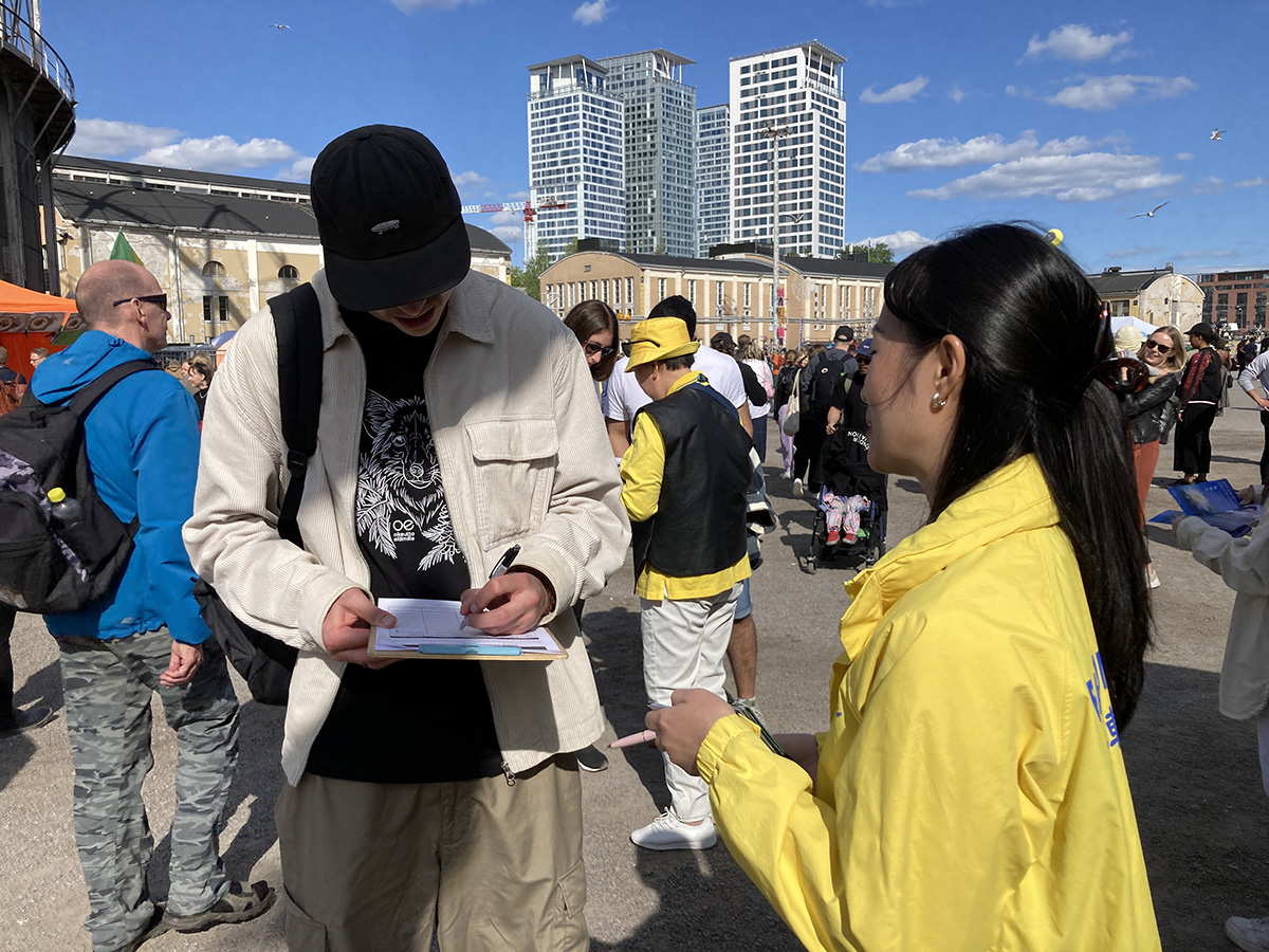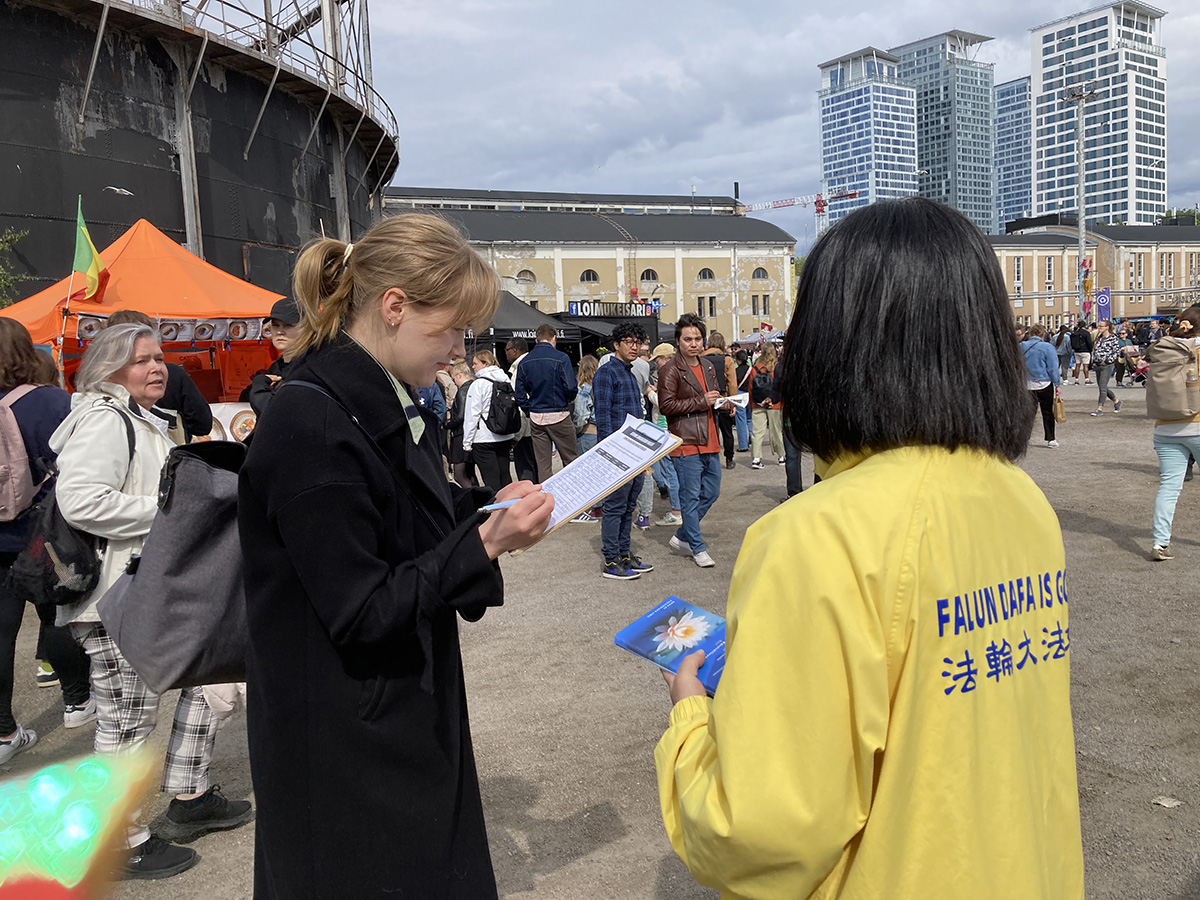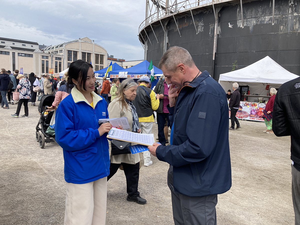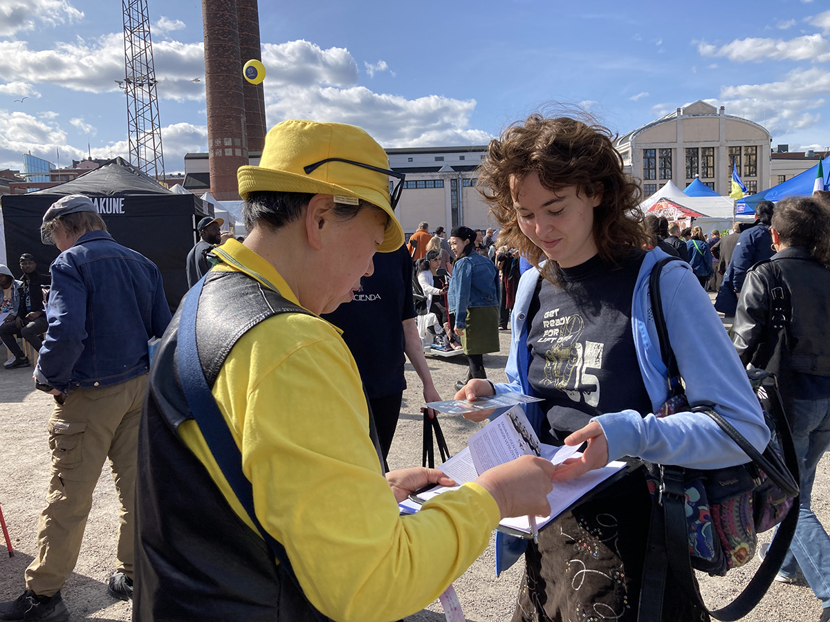 芬兰出生的華裔南希(Nancy)对法轮大法的真相点非常好奇,她不断的向学员提出各种问题,包括为什么用这样的方式讲述真相。当了解到法轮功学员遭受中共残酷的迫害,她非常震惊,并愿意在请愿书上签字。并告诉学员:“讲清真相,告诉人们在中国发生的事情,是一件非常重要的事。”她询问是否有其它可以帮助的事情,并高兴地把二零二三年刚出版的《明慧》期刊带回家阅读。她还告诉学员说:“修炼法轮功的外国人用中文与她交谈,这让自己更有动力去学好中文。”