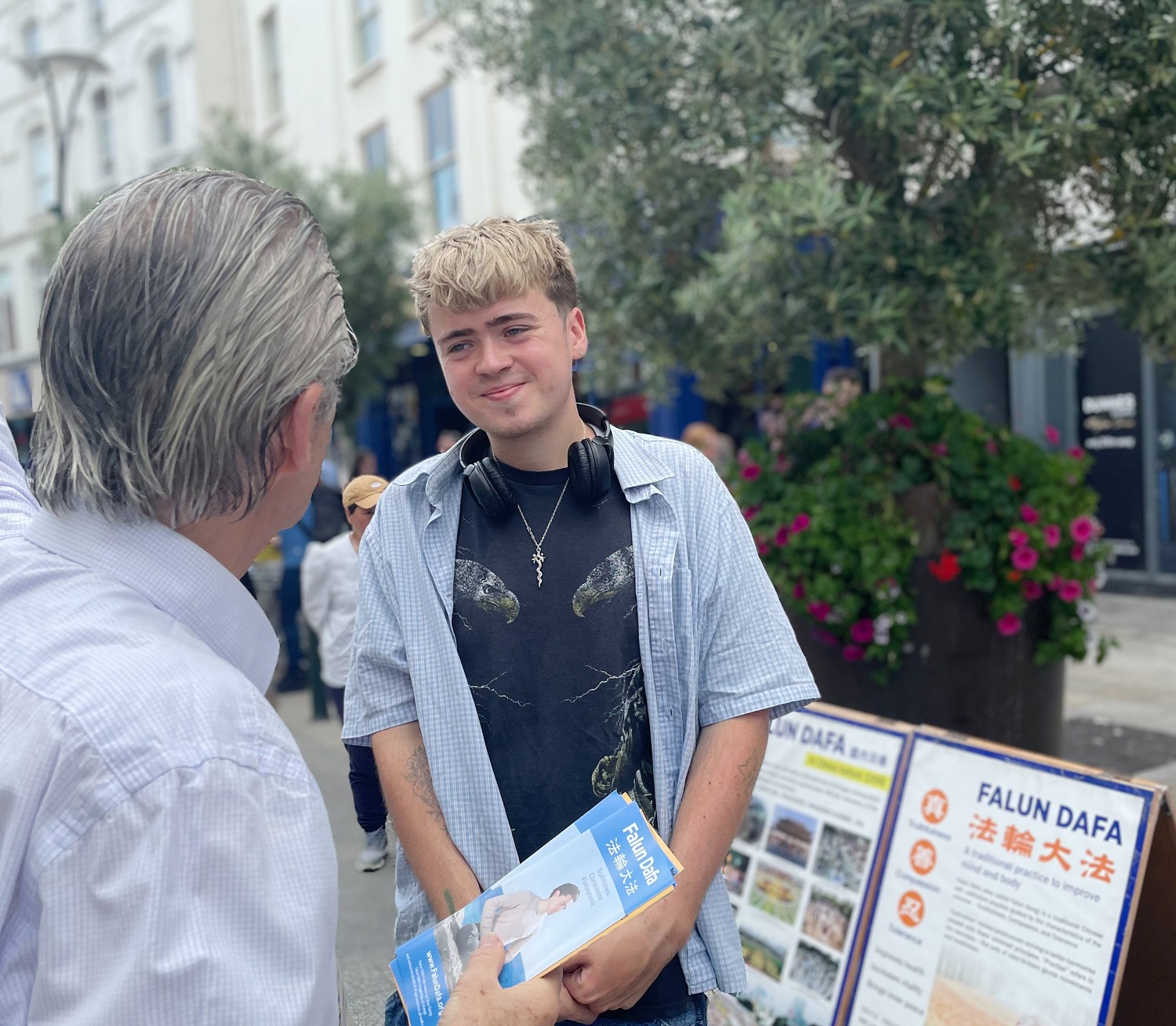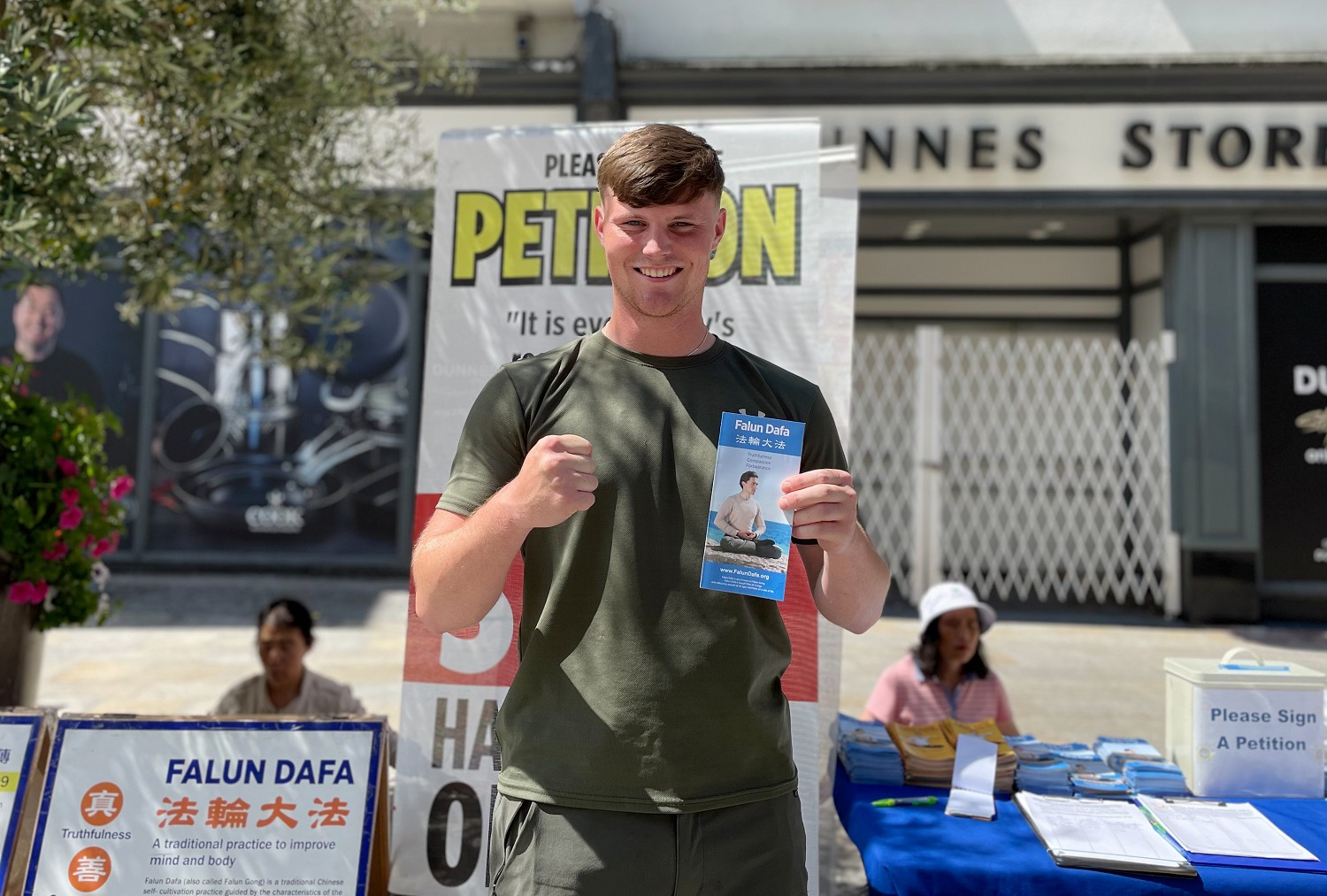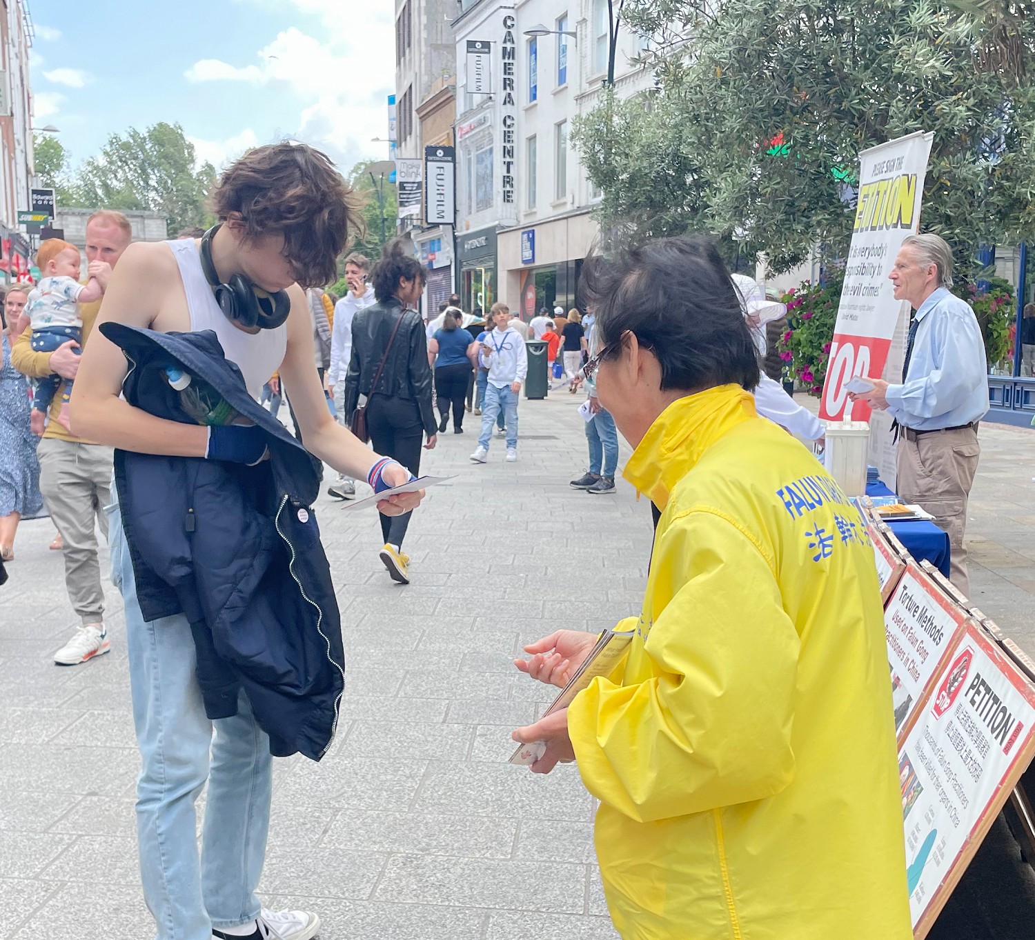 从英国来爱尔兰学习的乔尔(Joel)支持法轮功学员反迫害。乔尔表示,在伦敦读书时,他结识了一位朋友,那位朋友的父母就是法轮功修炼者,他也因此对法轮功有了一些了解。