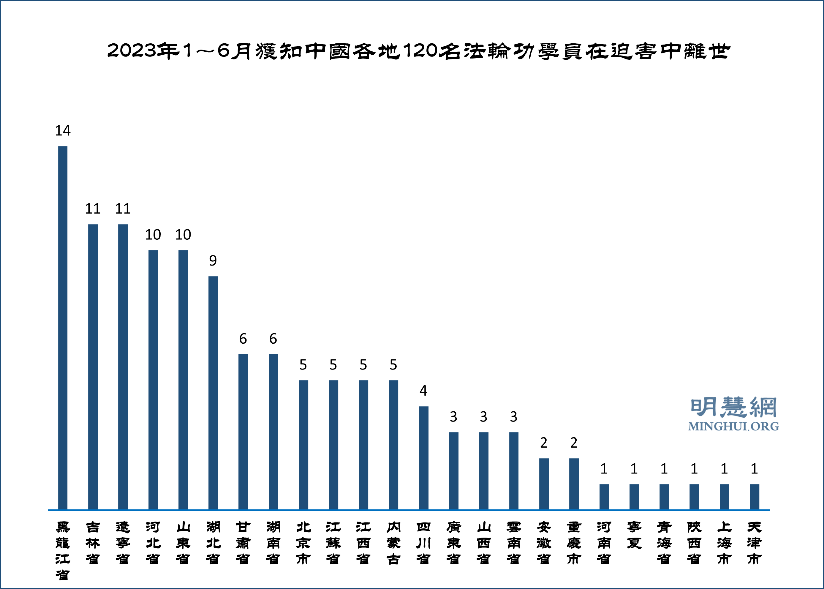 ![]() 图1:2023年1~6月获知中国各地120名法轮功学员在迫害中离世 |