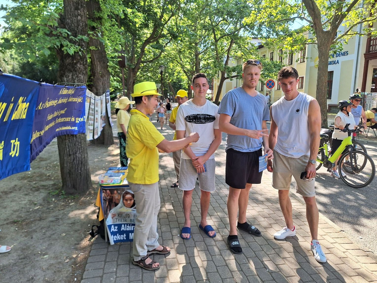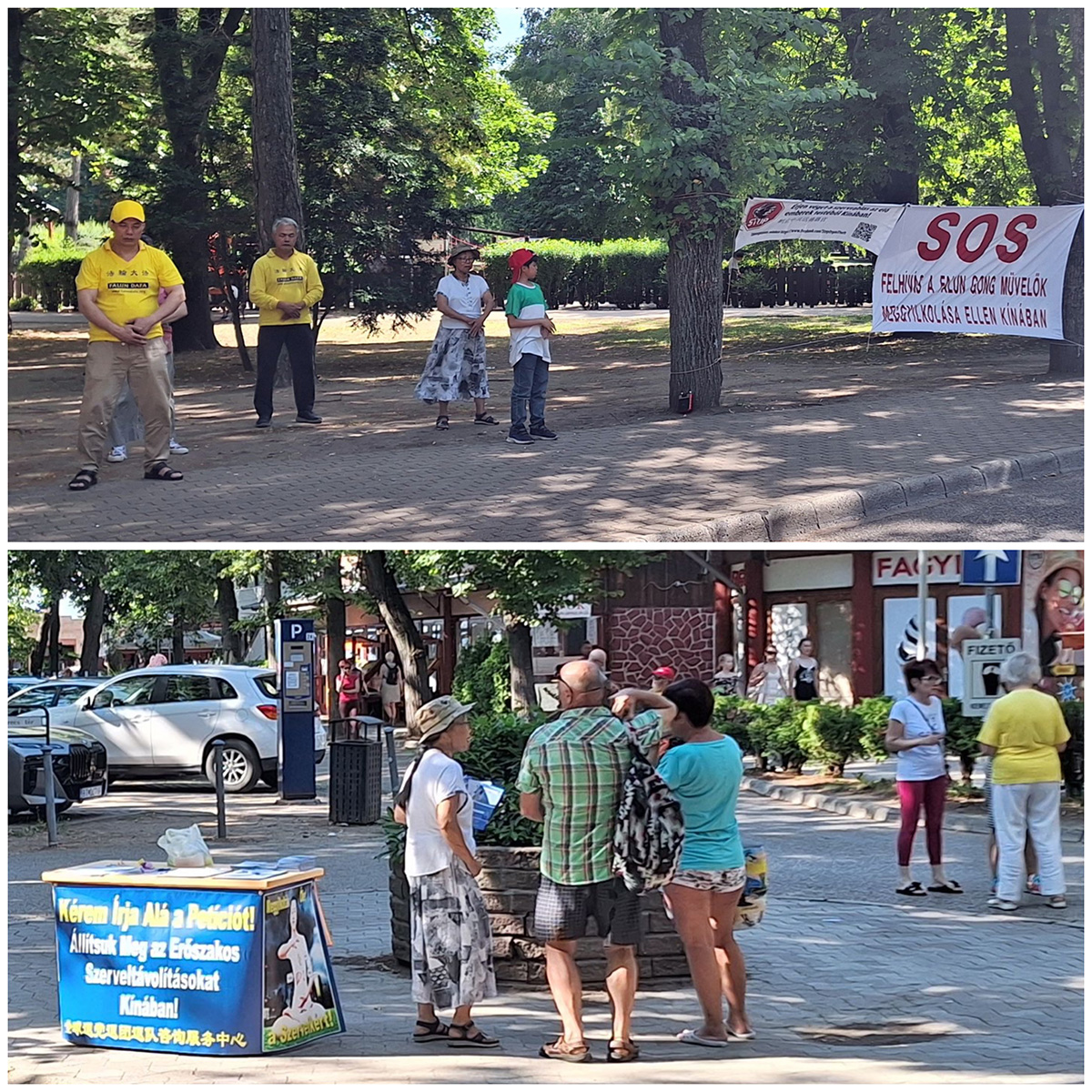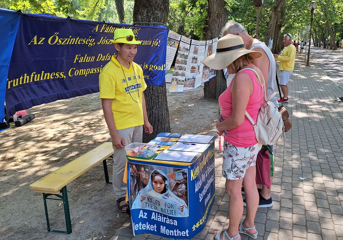希欧福克位于匈牙利巴拉顿湖南岸,欧福克主海滩的佩托菲长廊是匈牙利人和外国游客喜爱的夏季度假胜地。学员们在佩托菲长廊入口处设立了两个咨询台。许多来自德国和罗马尼亚的游客前来与学员交谈,了解真相。