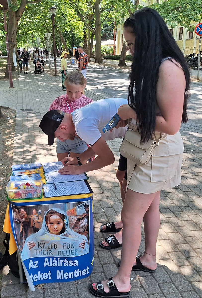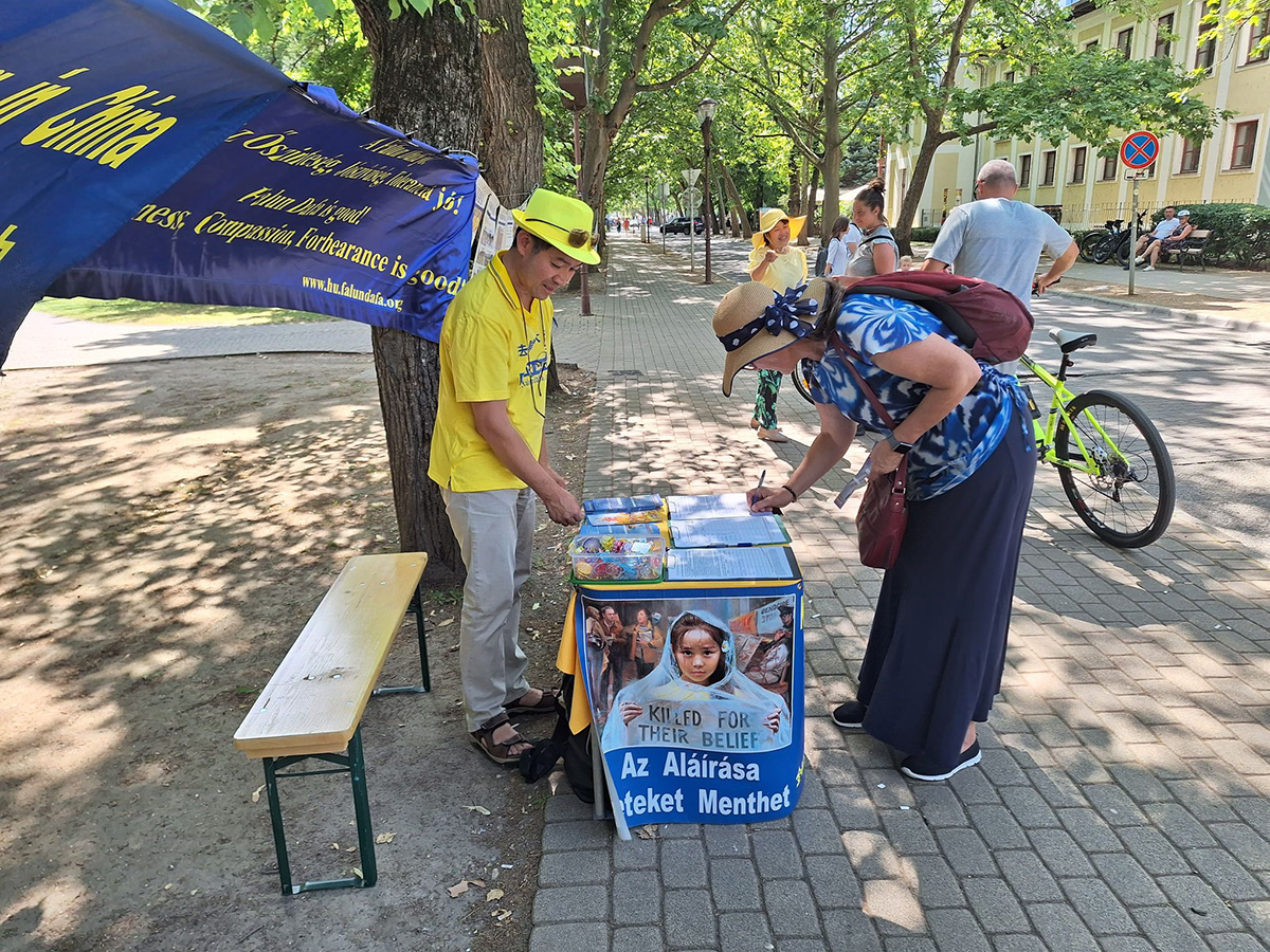 不少民众驻足观看法轮功学员展示法轮功功法,有人还尝试着跟学员学炼功法。很多民众支持法轮功学员制止迫害的努力,并签署请愿书,呼吁匈牙利政府正式谴责中共在中国迫害法轮功学员。