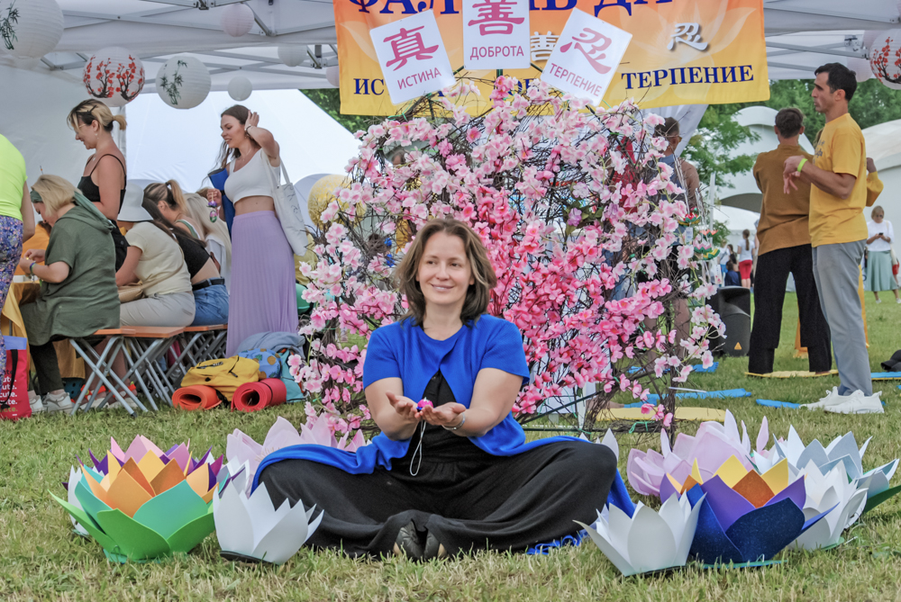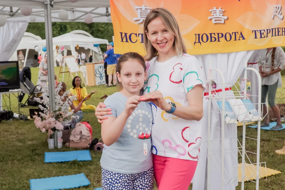 瑜伽教练瓦伦蒂娜(Valentina)带着女儿参加了制作莲花的活动。她被学员们善意所感动,并钦佩他们能按照法轮大法教导的价值观生活。