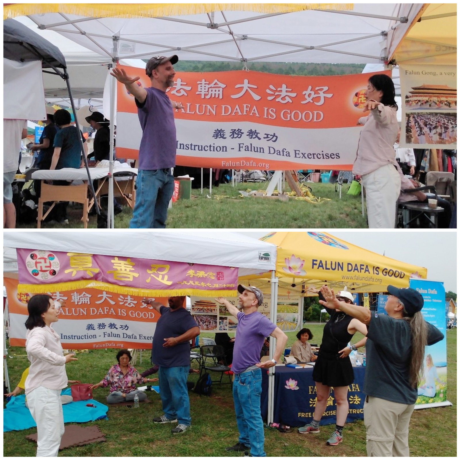 有位男士,路过展位时看到学员们祥和的炼功氛围,听说了法轮功能使人的心身得到改善,于是跟学员学习功法。他学了一套功法后感觉很不错,于是就把他的几个朋友也带来展位,让他的朋友们也能体验一下学炼法轮功的快乐。