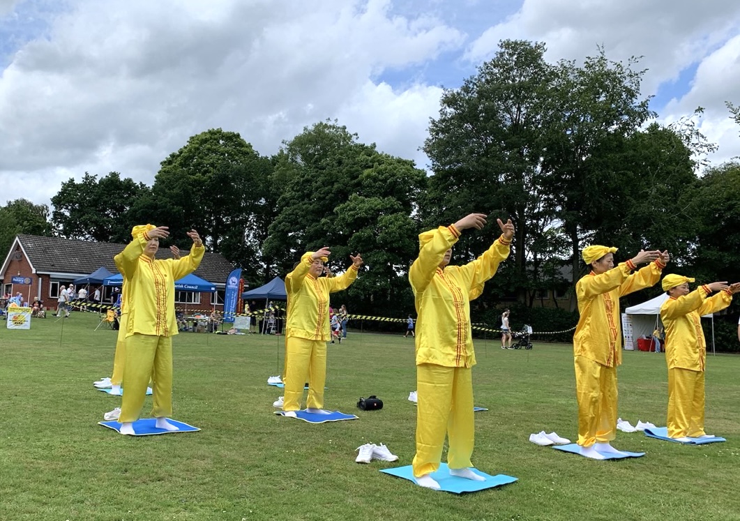 ![]() 图1:学员们展示了祥和宁静的五套法轮功功法。 |