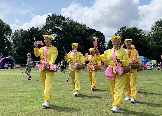 主办方安排法轮功腰鼓队第一个出场表演。学员们挥槌击鼓,浑厚有力,开启这个百年庆典活动。他们黄衣粉绸,踏着鼓点,绕场一周,所到之处,村民们热烈鼓掌欢迎。看到法轮功学员的腰鼓表演,人们赞叹道:“哇! 这么整齐的队列,这么优美的音乐,这么漂亮的服装,太酷啦!”