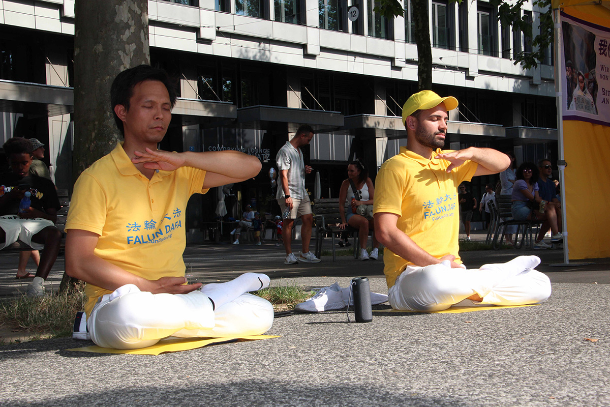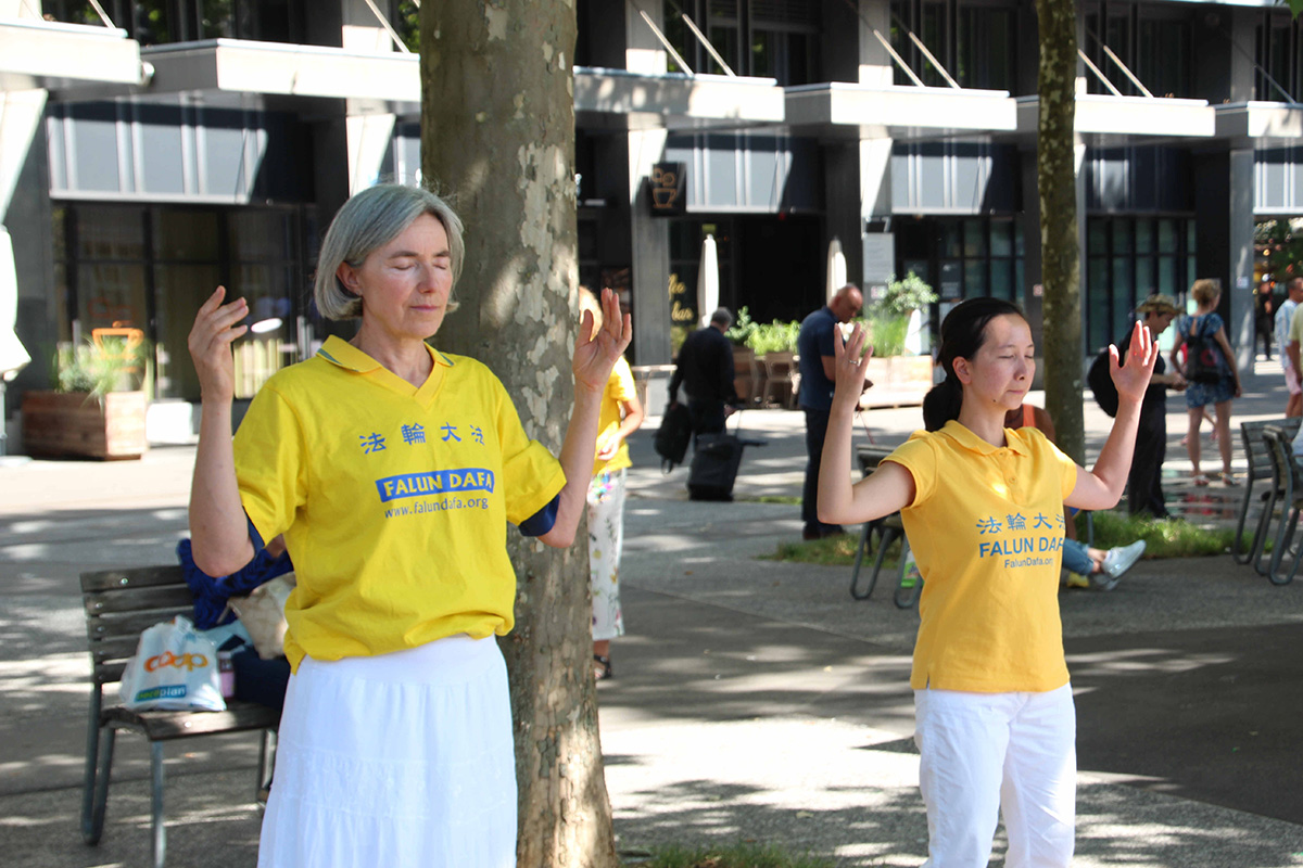星期六上午八点,法轮功学员首先在旧金山渡轮大厦(Ferry Building)前集体炼功,展示祥和优美的功法。许多游客被吸引,了解什么是法轮功。还有的人看到这么祥和的炼功场面,模仿着学员的动作学炼。