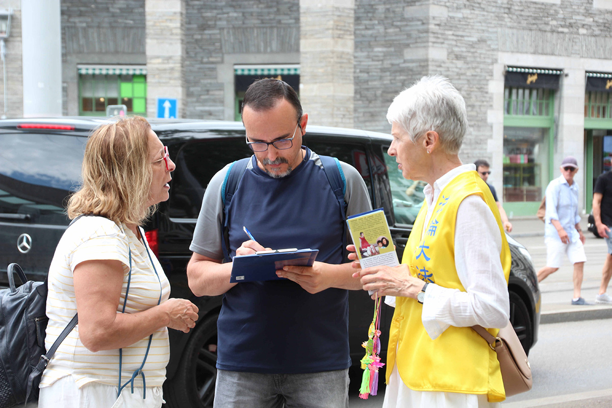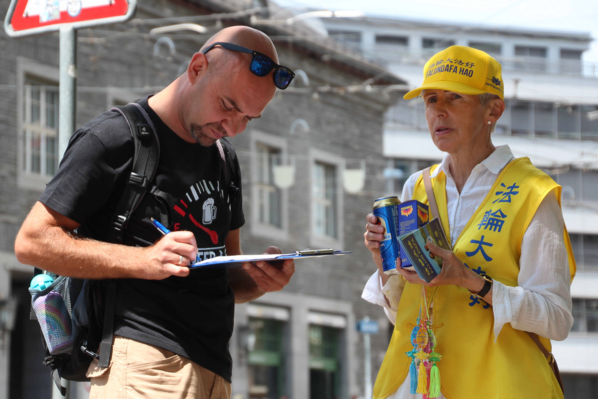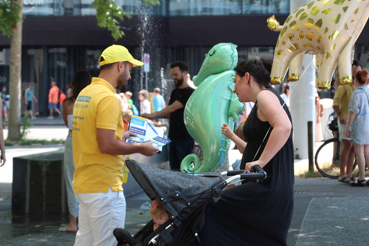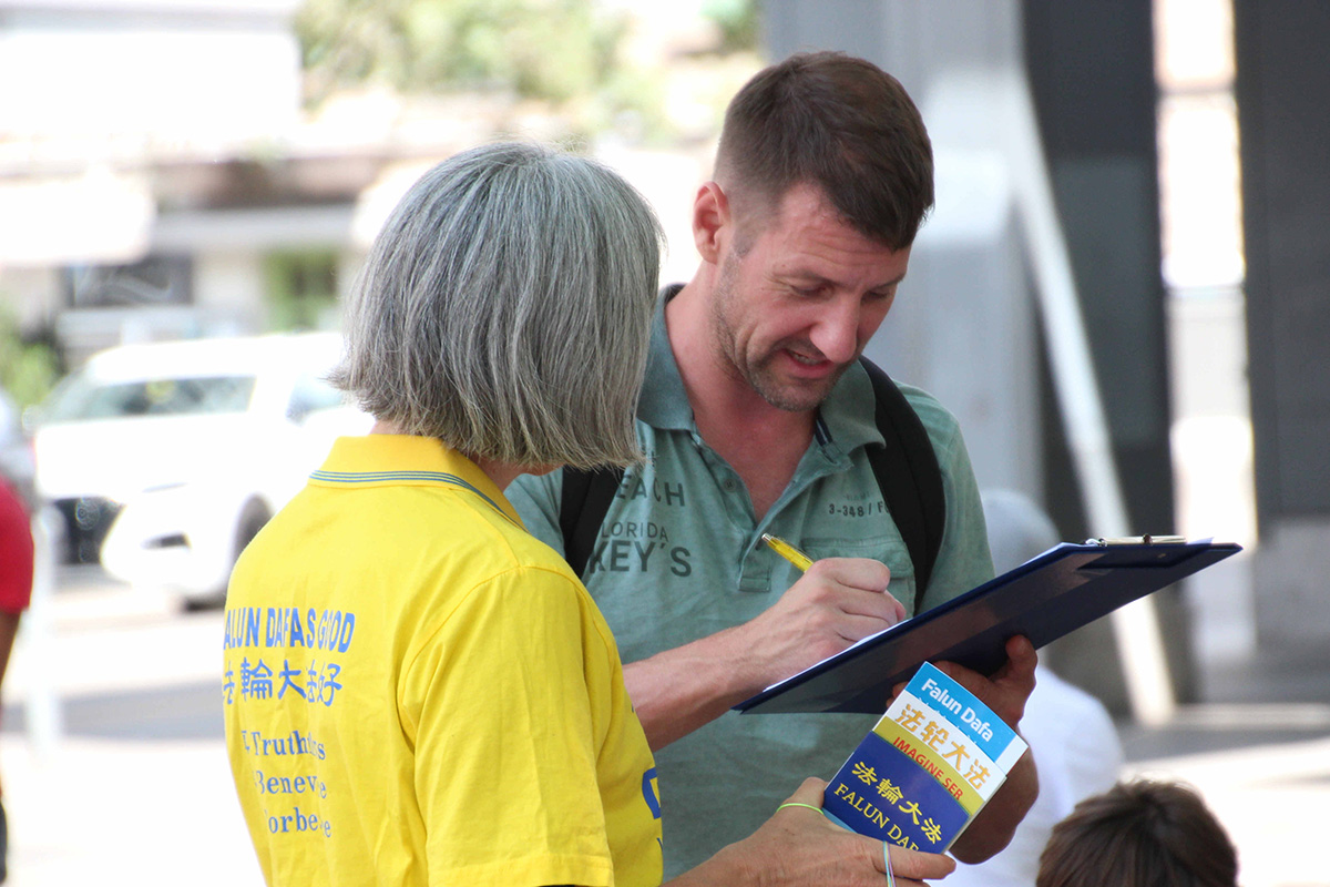 活动当天有不少从国内来旅游或出差的华人,想了解有关法轮功资讯。还有当地华人特别过来支持,并说“你们做得真棒,中共就怕你们法轮功”。