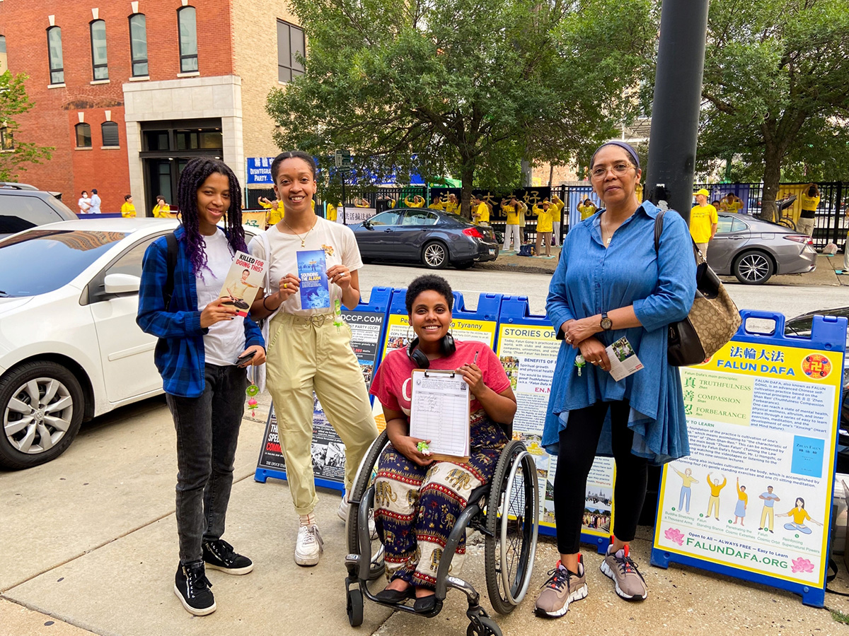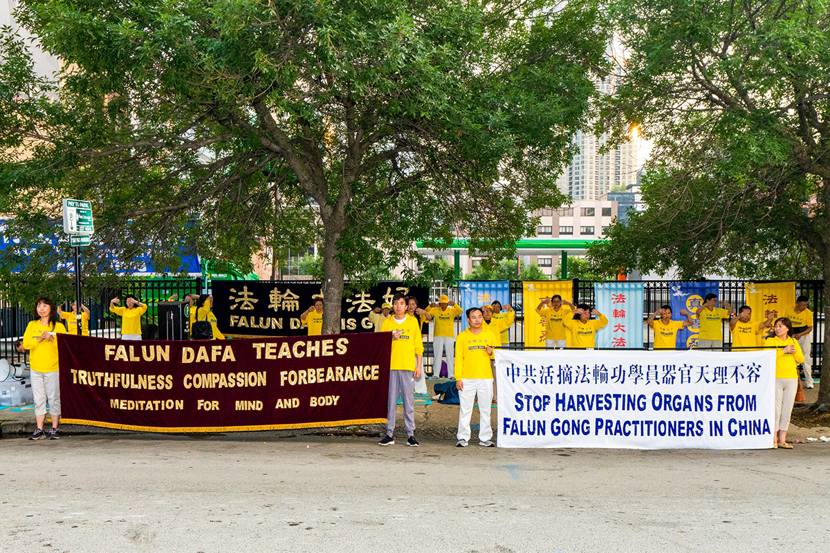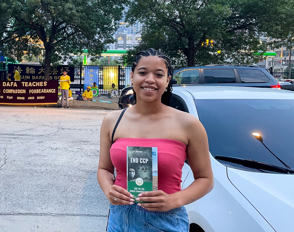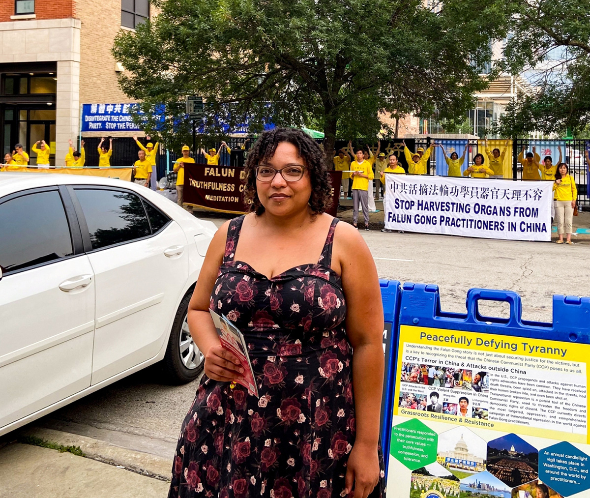来自密苏里州的莎拉·普瑞(Sierra Pureé)正在芝加哥旅行,她住在附近的一家旅馆,听到窗外传来的法轮功炼功音乐、看到楼下法轮功学员打坐的场面,她说她“必须下去体验这个活动”,“学习打坐”。莎拉表示,这种非常好的抗议方式给她留下了深刻的印象,她相信(抗议)可以让人们了解发生在中国的迫害,她希望自己也能够提供更多支持、帮助。