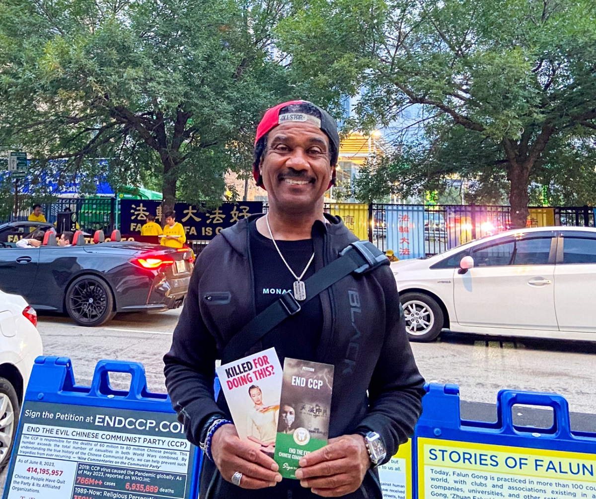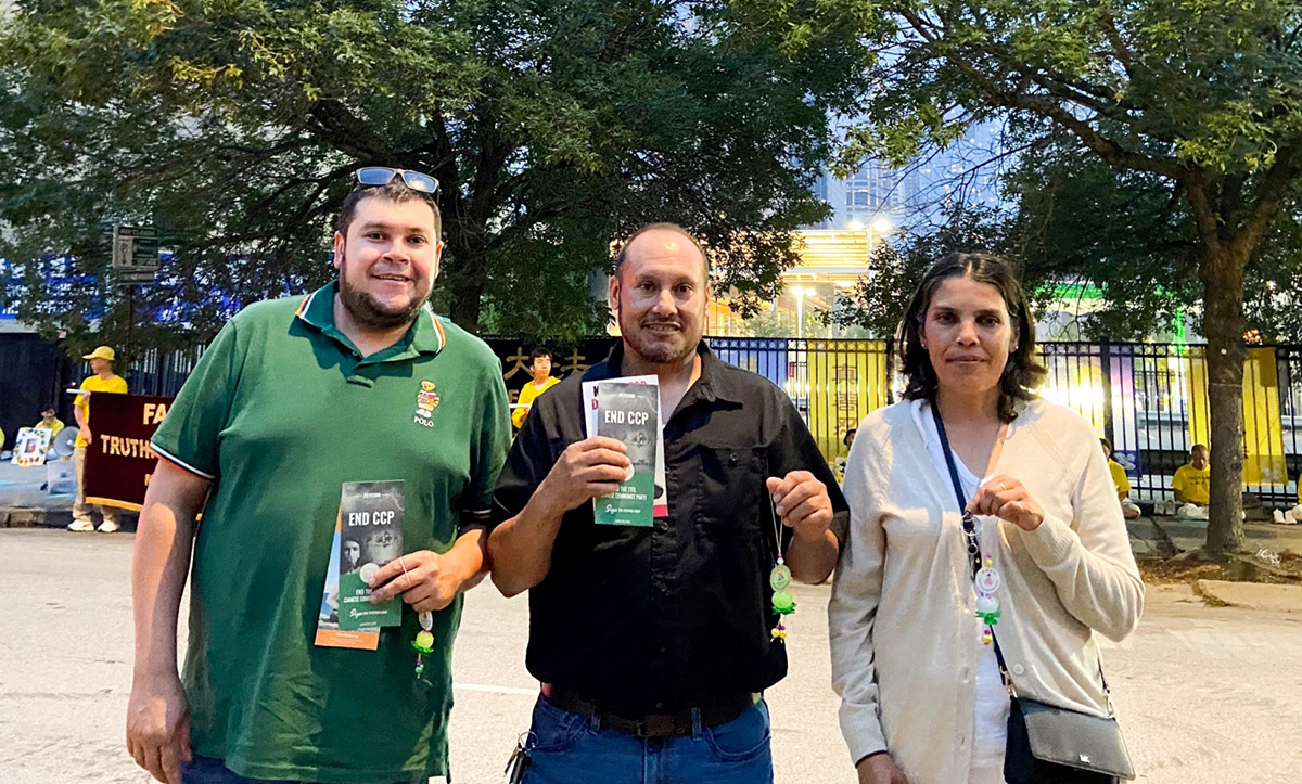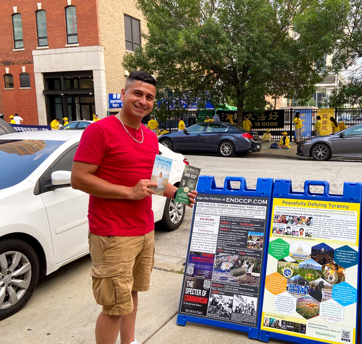 胡安·洛佩兹(Juan Lopez)对法轮标志很好奇,法轮功学员给他讲了法轮和卍字的悠久历史。他说他很感激了解了这些。胡安说:“真、善、忍的原则非常美好!”“共产主义非常糟糕,它不应该再存在!”他并立即在“终结邪恶的中共政权”(End CCP)的请愿书签名支持。