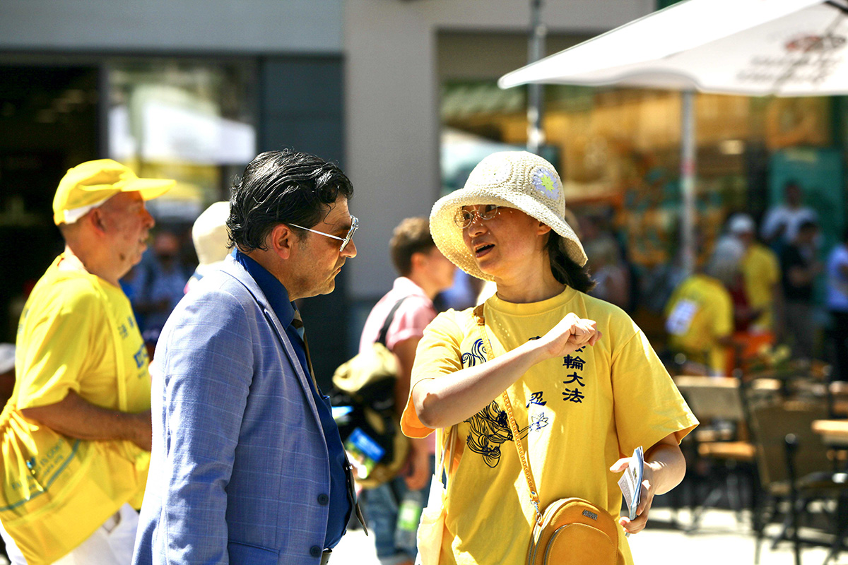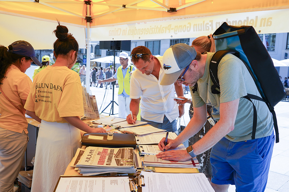 过往民众纷纷驻足观看,当明白了中共迫害法轮功的真相之后,很多人纷纷签名,声援法轮功学员反迫害。