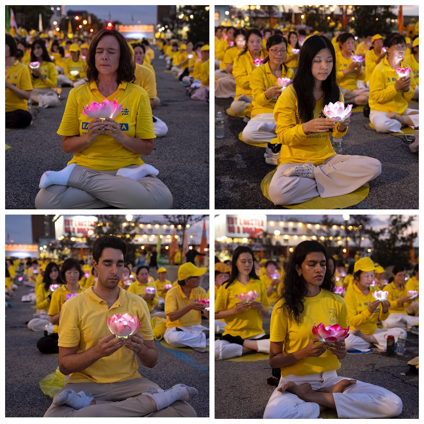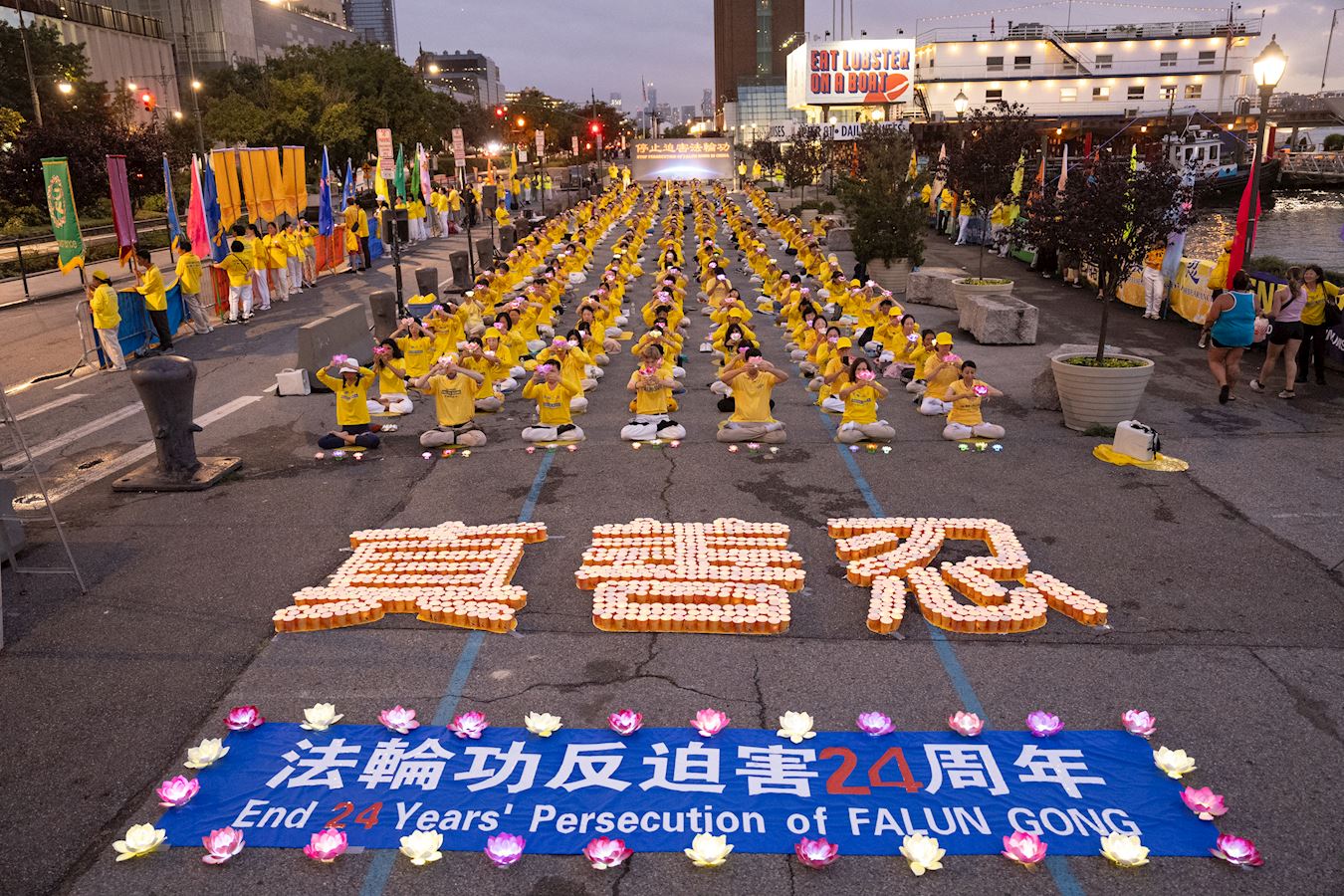 数百名法轮功学员在中领馆前静静地炼功。夜幕降临,华灯初上,学员们点燃烛光,感人的诗朗诵和悲壮的歌声在夜色中响起……一些居民、游客看到这壮观的场景,纷纷停下脚步观看、拍照摄影,接过介绍法轮功的传单,了解真相。