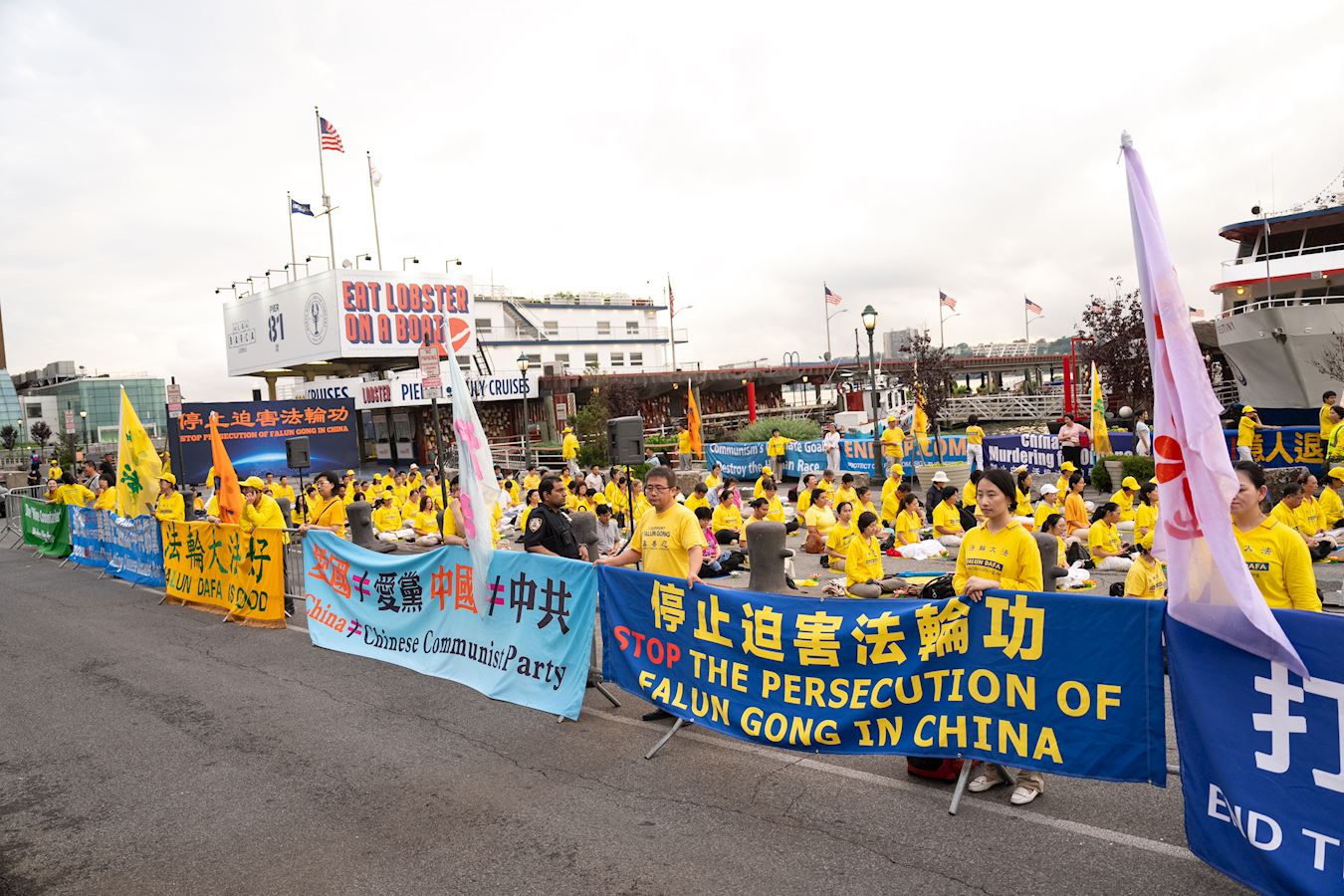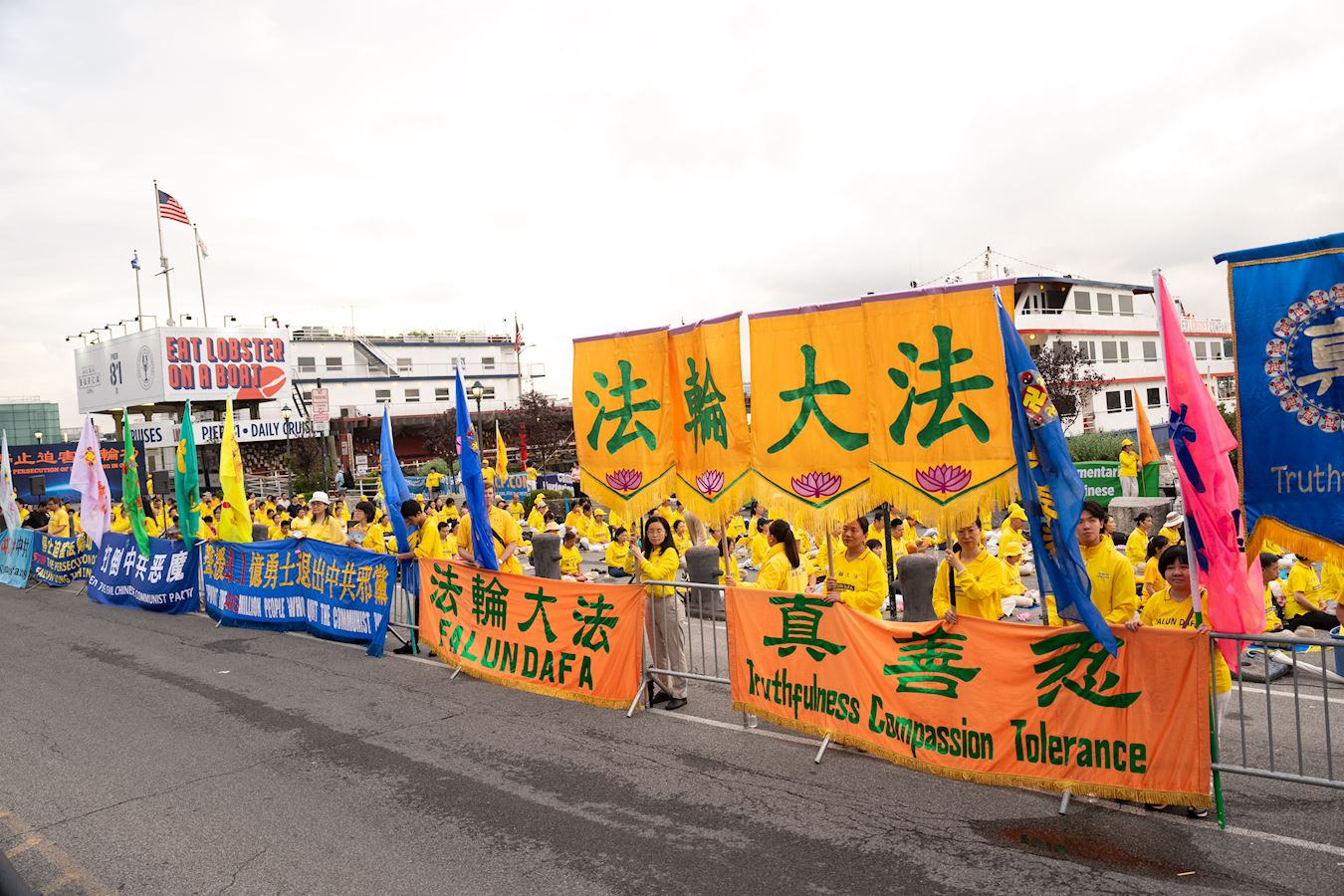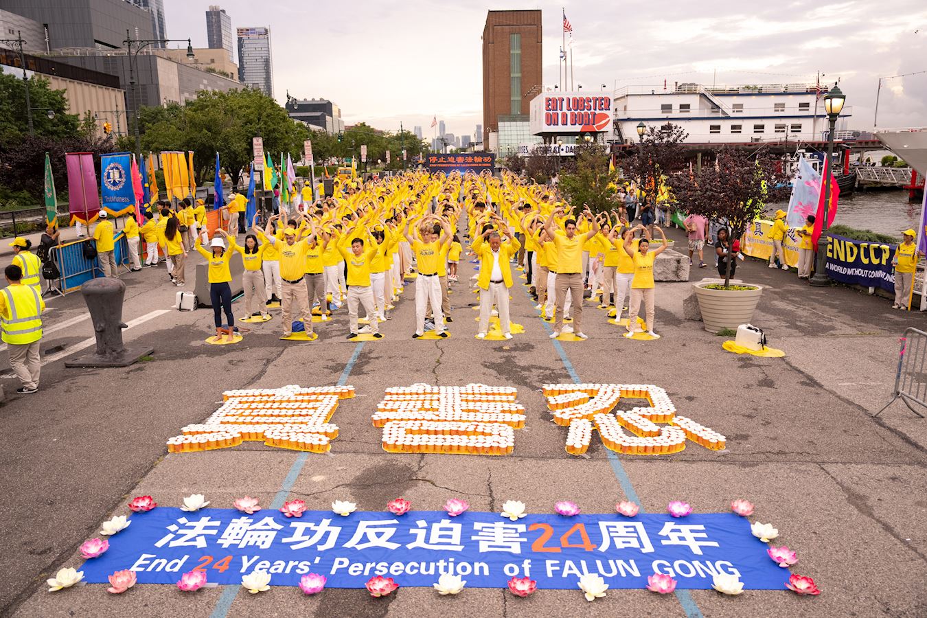 曼哈顿哈德逊河畔,法轮功学员面向中领馆打出“法轮大法”、“真善忍”、“停止迫害法轮功”、“声援4.1亿勇士退出中共邪*党-”等橫幅。播放全球.退:党!大潮视频的LED真相车,环绕中领馆所在地的十二大道行驶。