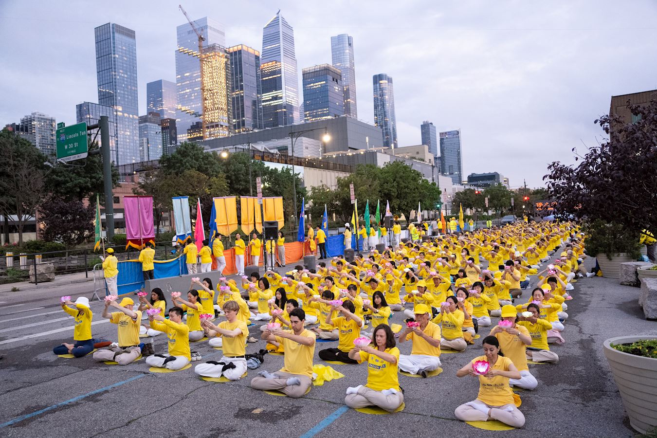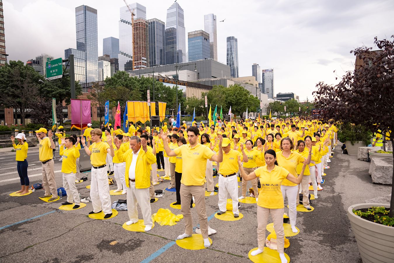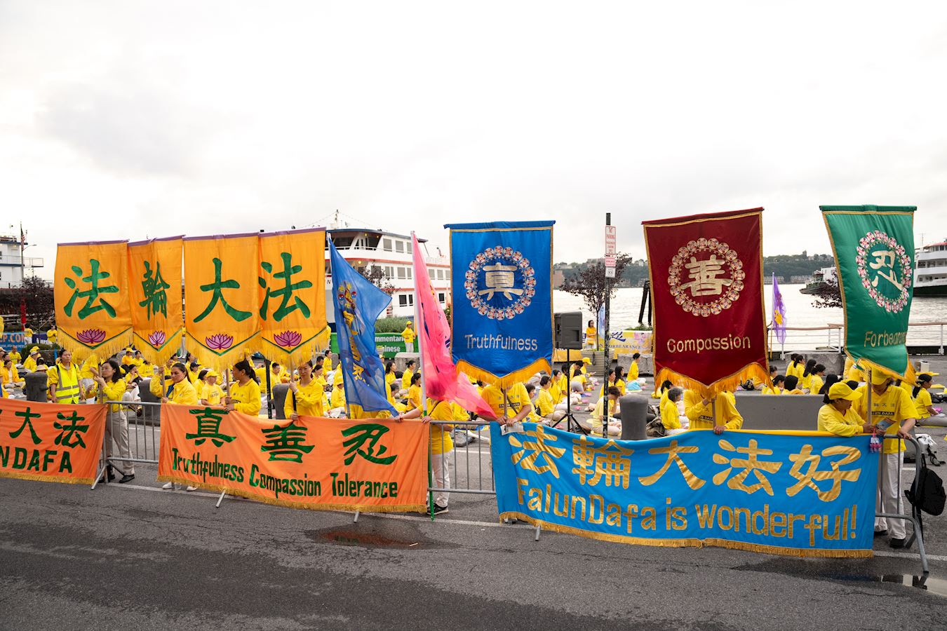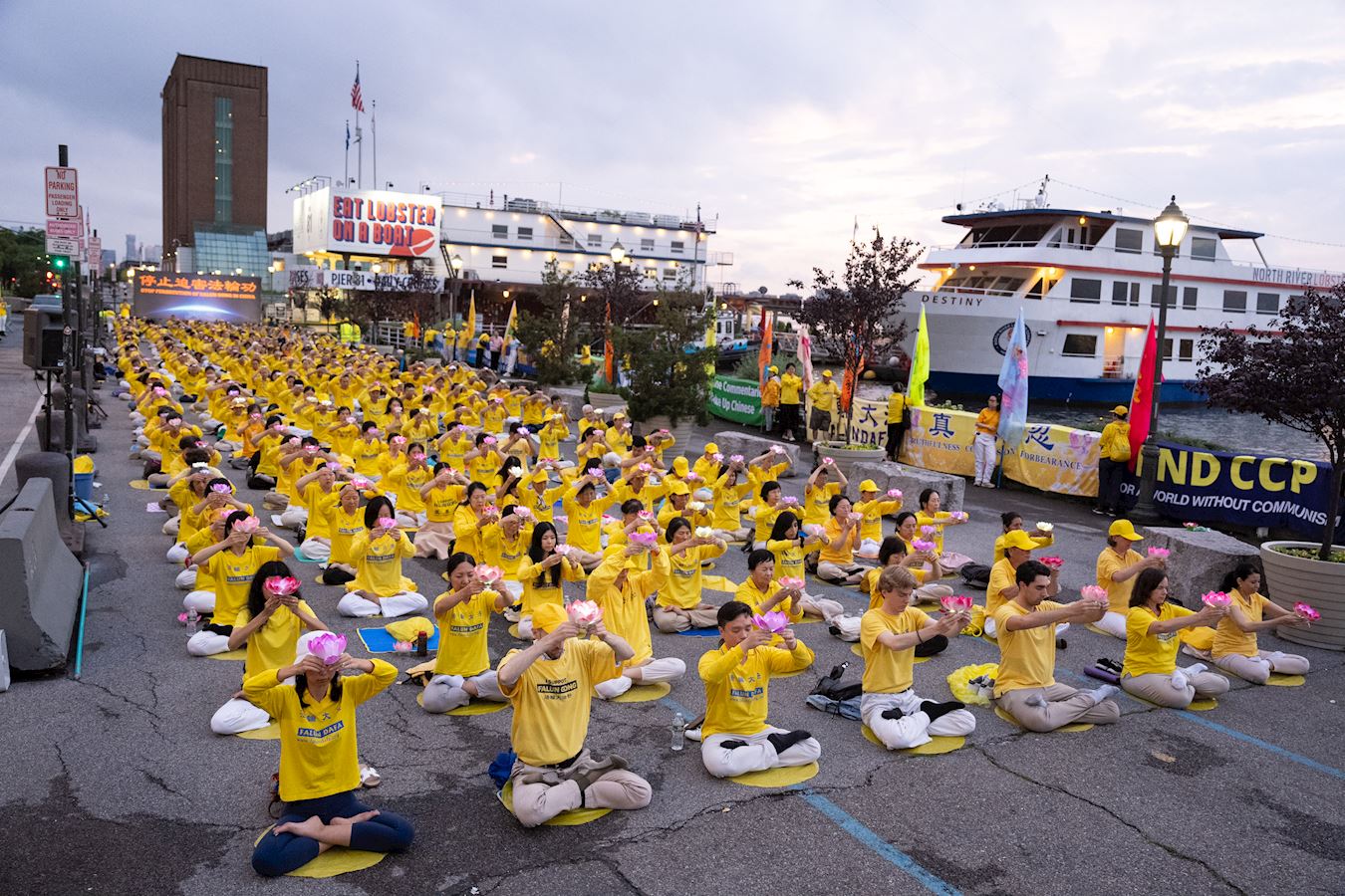 曼哈顿哈德逊河畔,法轮功学员面向中领馆打出“法轮大法”、“真善忍”、“停止迫害法轮功”、“声援4.1亿勇士退出中共邪*党-”等橫幅。播放全球.退:党!大潮视频的LED真相车,环绕中领馆所在地的十二大道行驶。