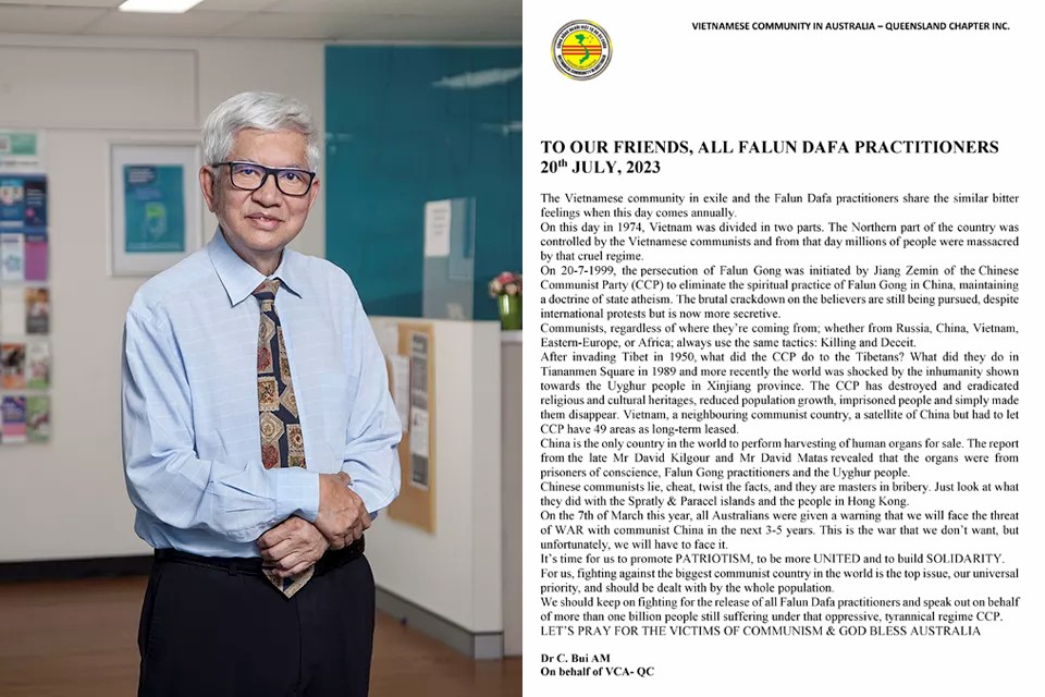 全球共产主义受难者协会澳洲主席、昆省越南小区主席、获澳洲勋章和资深医师布伊(Dr. Cuong Bui OAM、President of the Vietnamese Community in Australia’s Queensland Chapter),代表越南社团致信声援,信中写道:“一九九九年七月二十日,江泽民发起了对法轮功的迫害,旨在消灭中国的法轮功修炼团体,对法轮功学员残酷迫害仍在继续进行,只不过现在更加隐秘。”