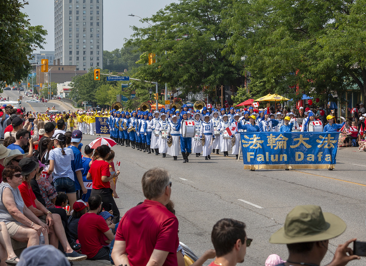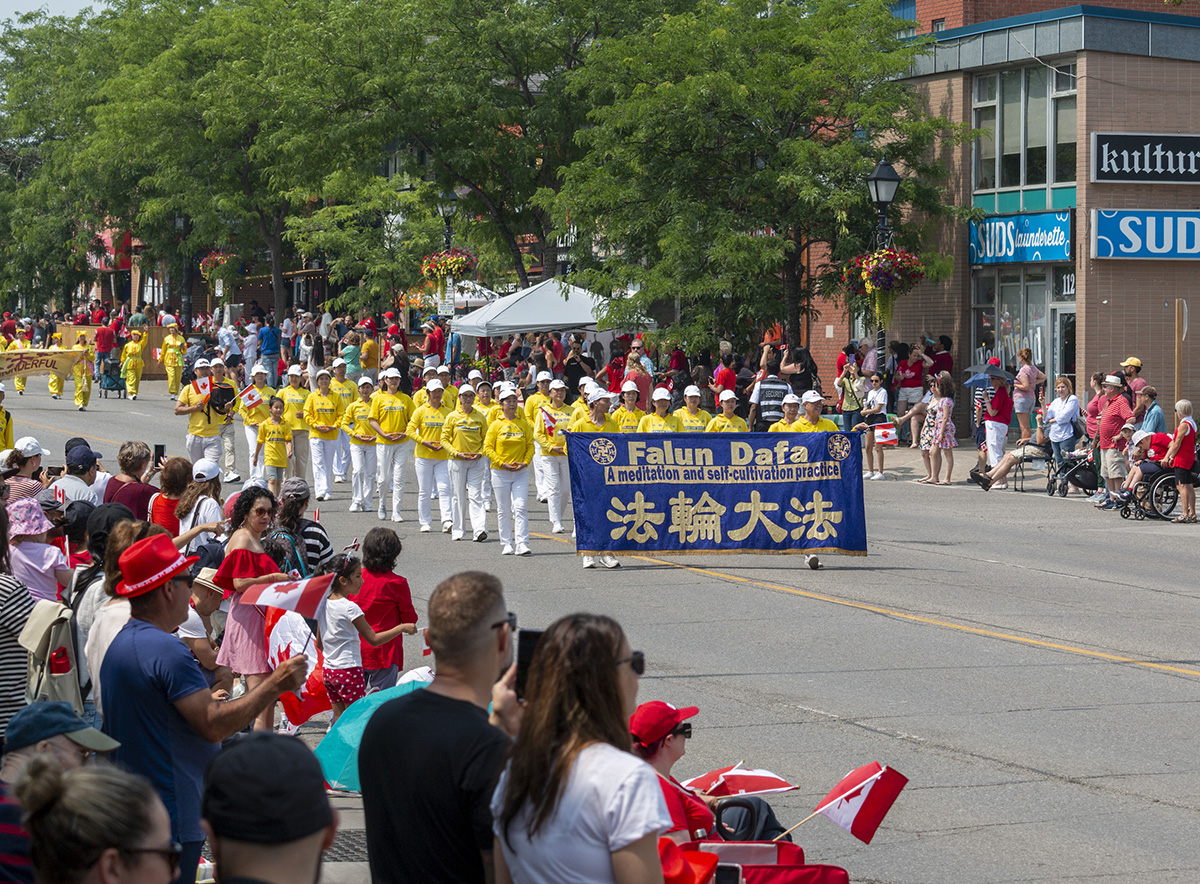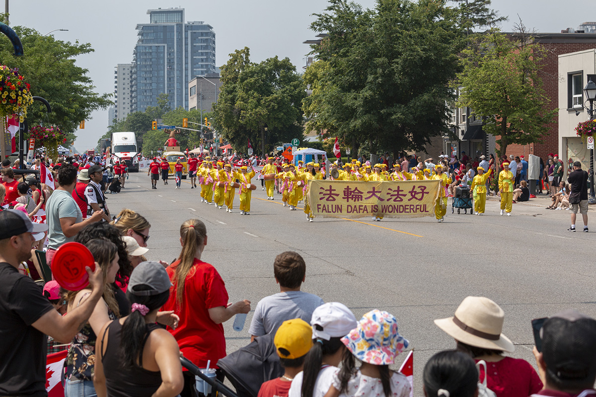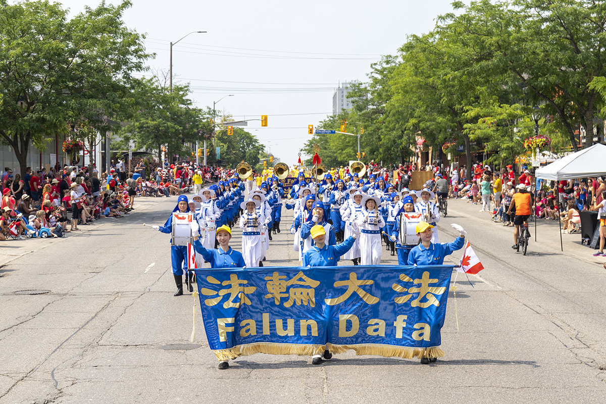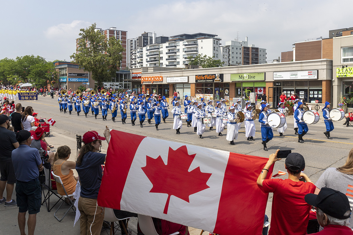 ![]() 图1~5:七月一日,由多伦多法轮功学员组成的天国乐团,炼功队和腰鼓队参加密西沙加市的国庆节大游行 |