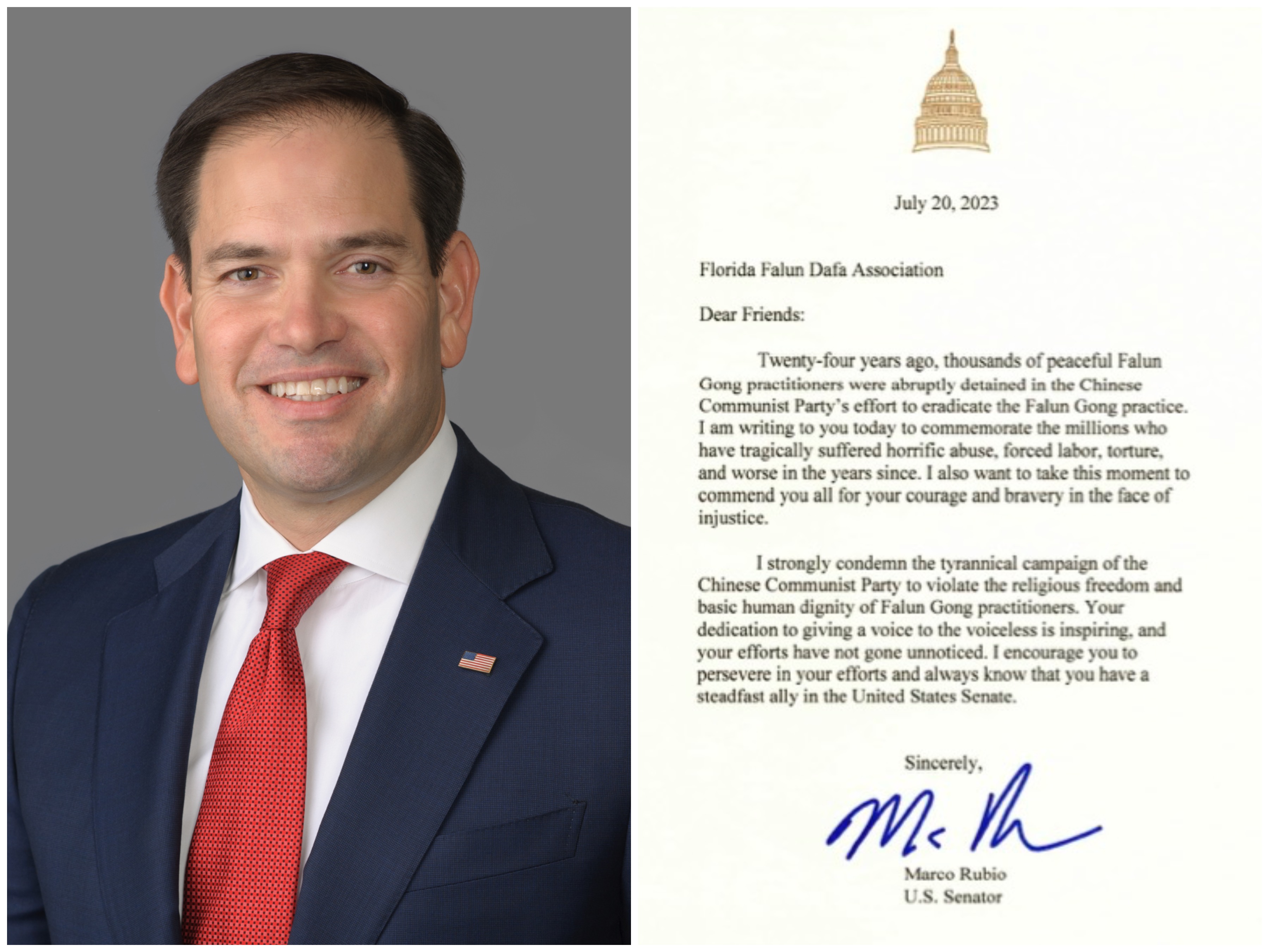 美国佛罗里达州联邦参议员马可·卢比奥(Marco Rubio)在写给佛罗里达法轮大法学会的声援信中说:“二十四年前,在中共发动铲除法轮功的运动中,成千上万和平的法轮功修炼者突然被关押。我今天写信给你们,是为了纪念自那时以来不幸遭受可怕的虐待、强迫劳动、酷刑和更糟糕(迫害)的数百万人。我也想借此机会赞赏你们所有人面对不公所展现的勇敢和勇气。”