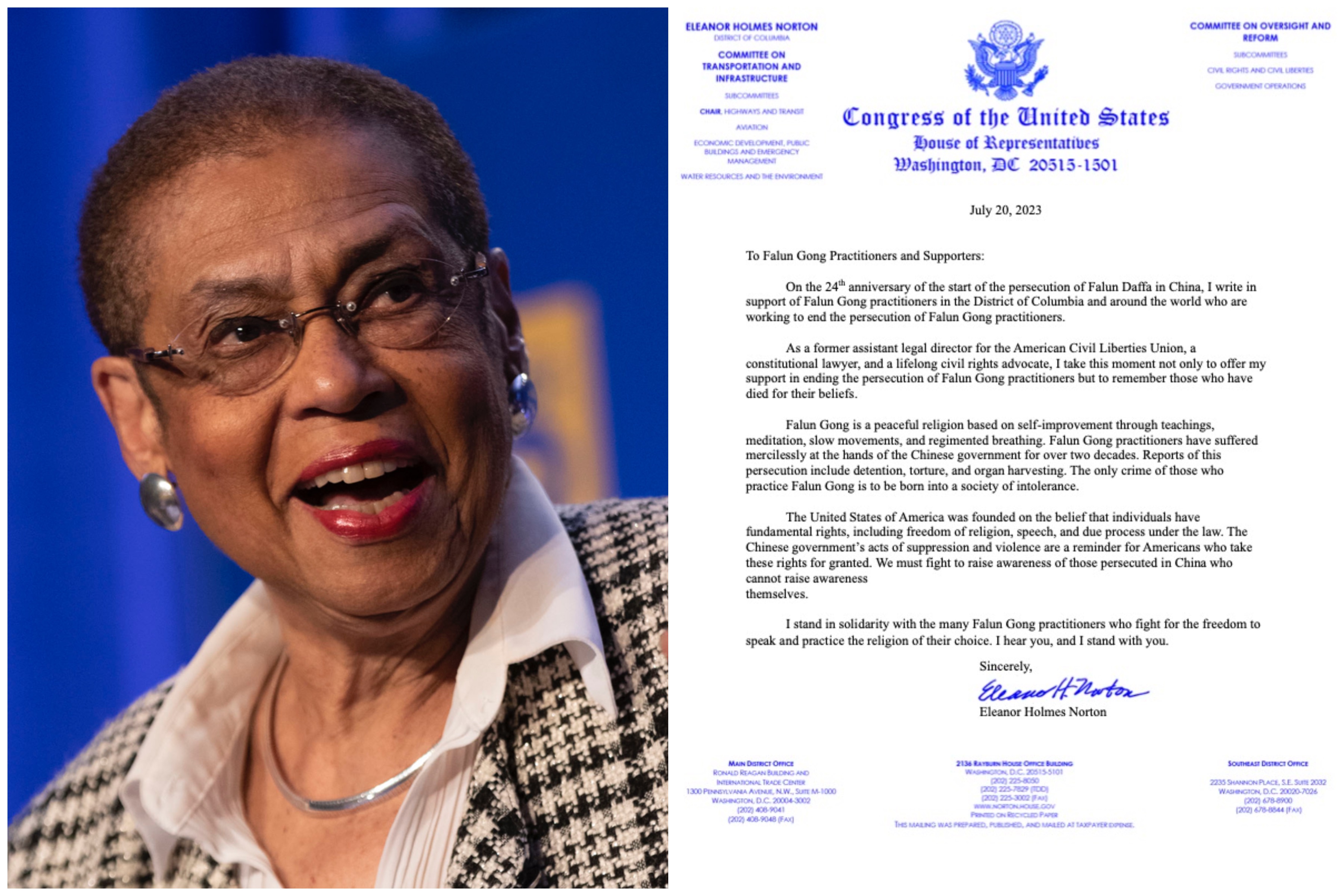 华盛顿哥伦比亚特区联邦众议员埃莉诺·霍姆斯·诺顿(Eleanor Holmes Norton)致信声援法轮功学员。她说:“我写这封信是为了支持华盛顿特区和全世界的法轮功学员努力结束(中共)对法轮功的迫害。”