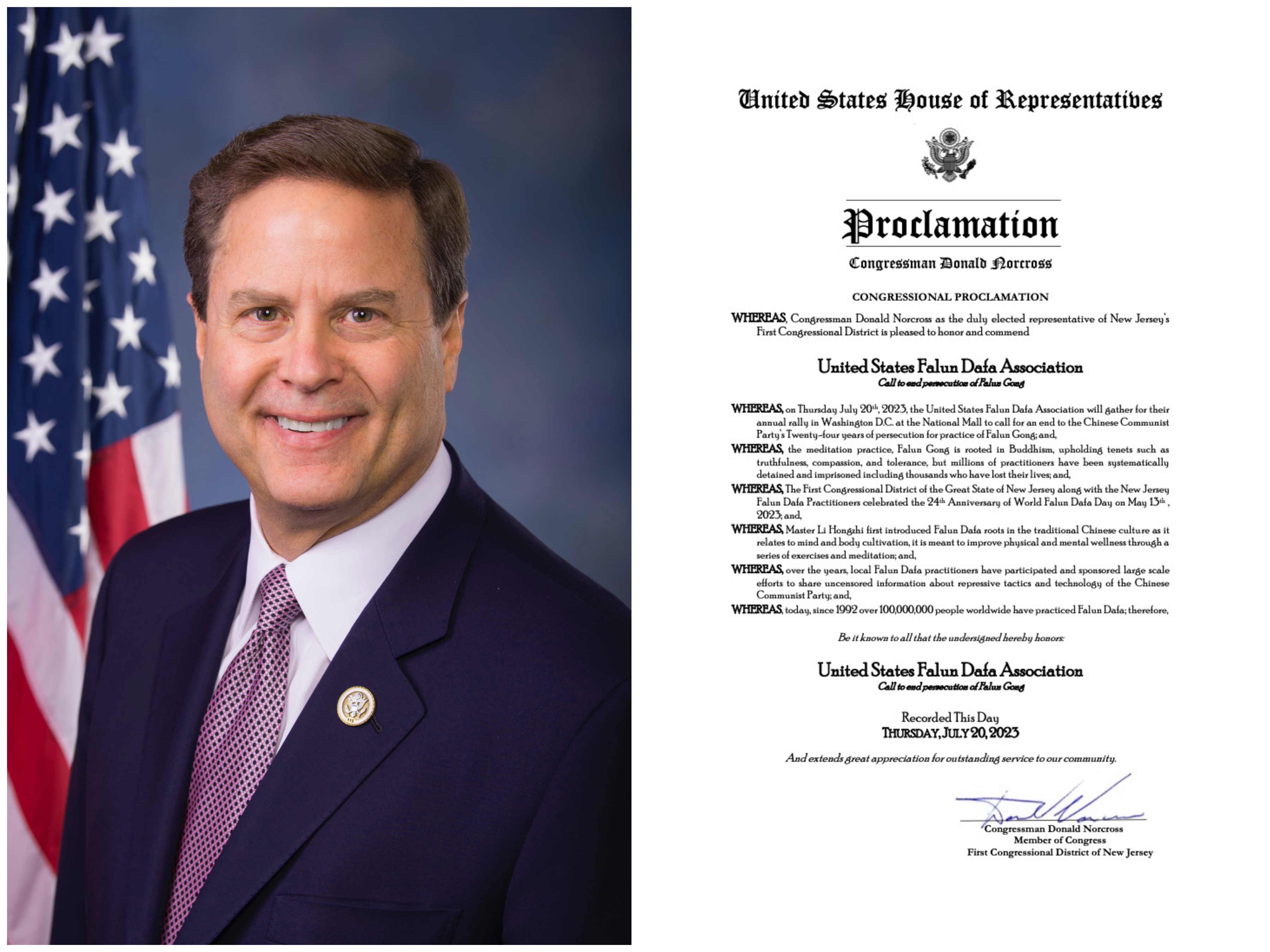 美国新泽西州联邦众议员唐纳德·诺可罗斯(Donald Norcross)为美国法轮大法学会颁发褒奖,对于法轮大法学会呼吁停止迫害法轮功表达敬意和赞赏。