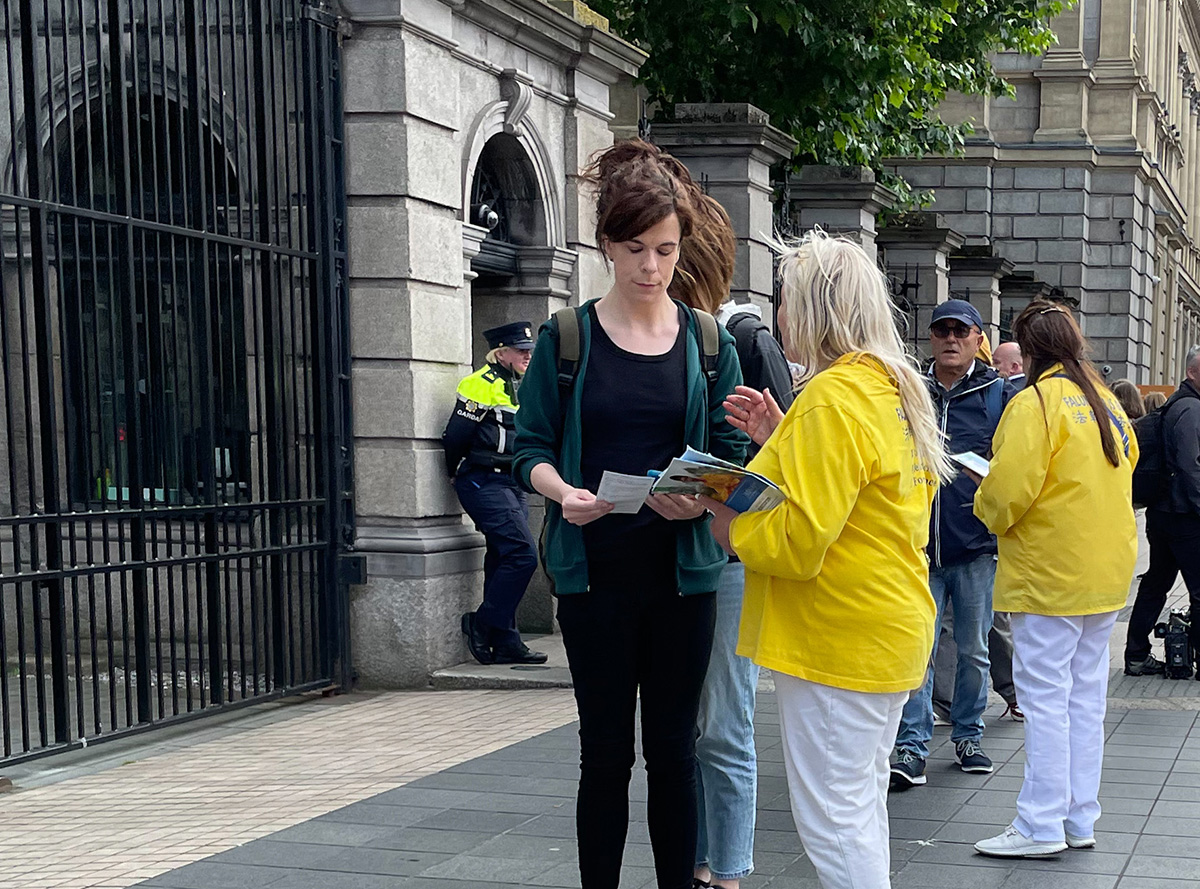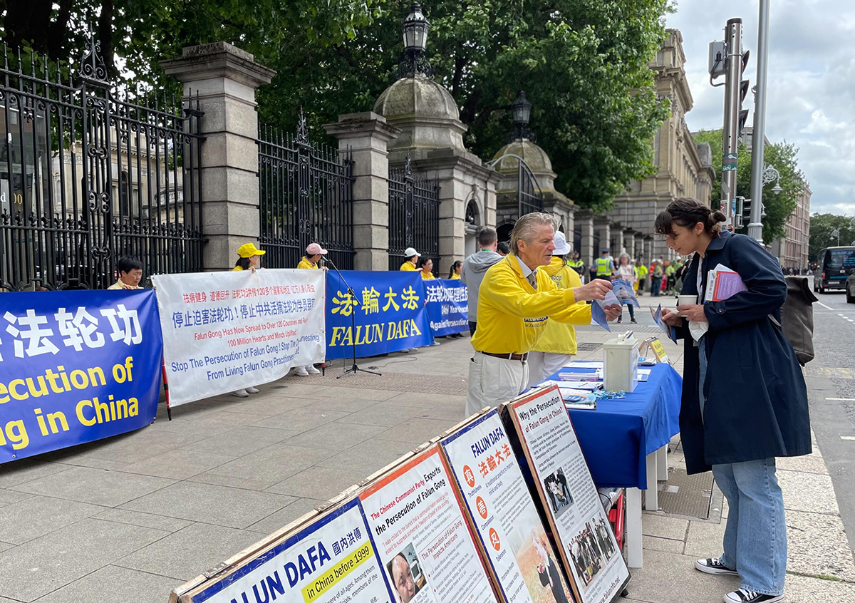伦斯特府(Leinster House)是爱尔兰参众两院所在地,法轮功学员在国会广场外摆出横幅与展板,伴随着祥和的炼功音乐,展示法轮功舒缓优雅的功法。现场平和的气氛,吸引了过往的政府工作人员,了解到学员因坚守真、善、忍的信仰,被残酷迫害,甚至被中共活摘器官,不少人签名声援学员反迫害。