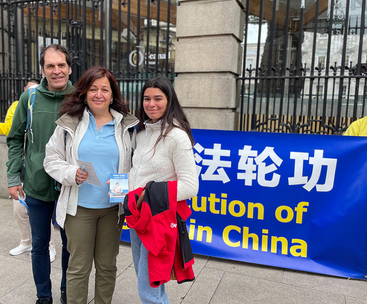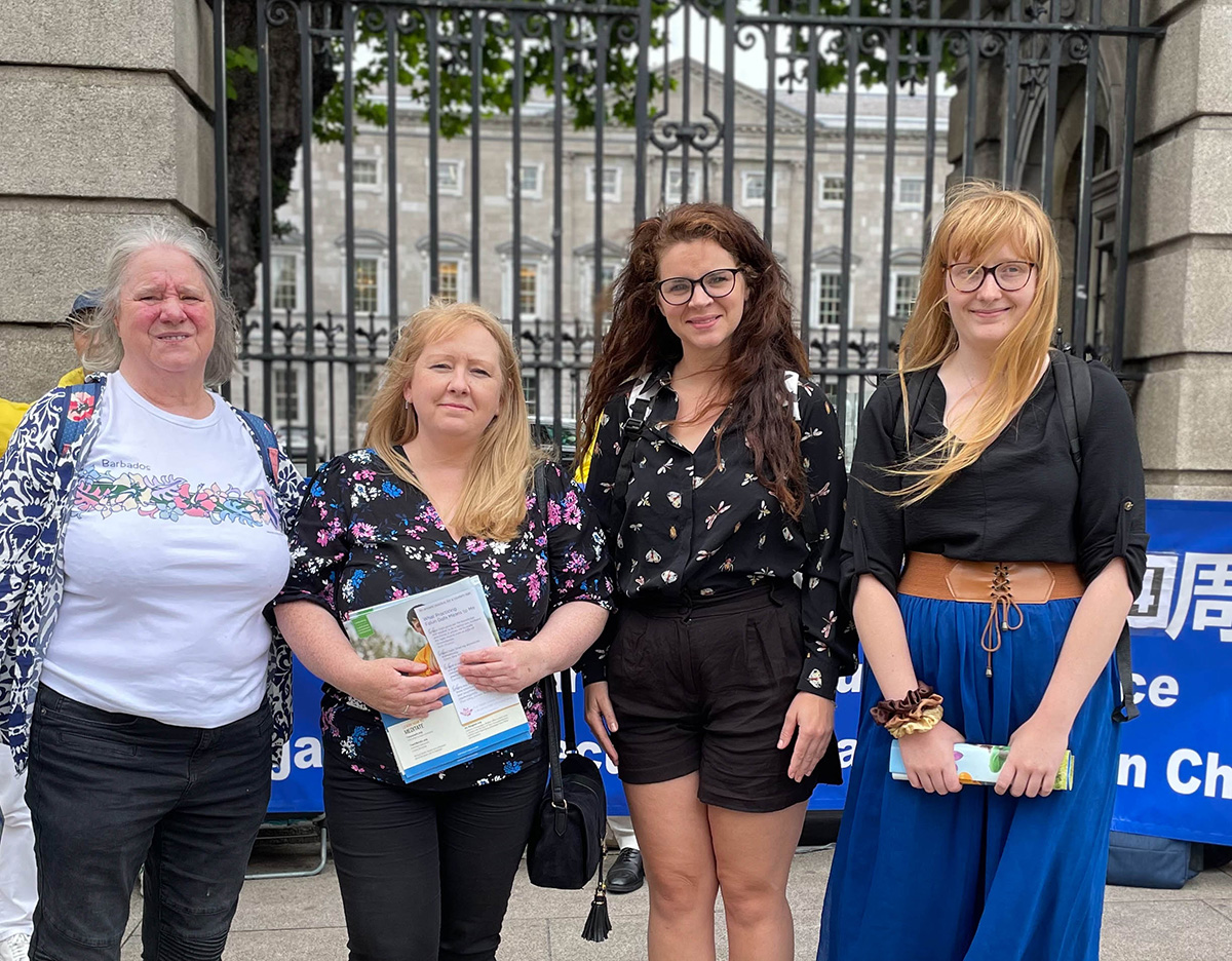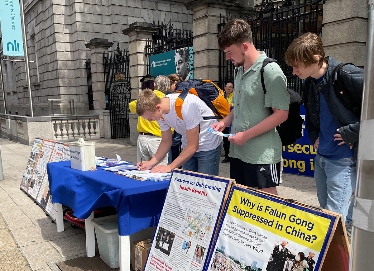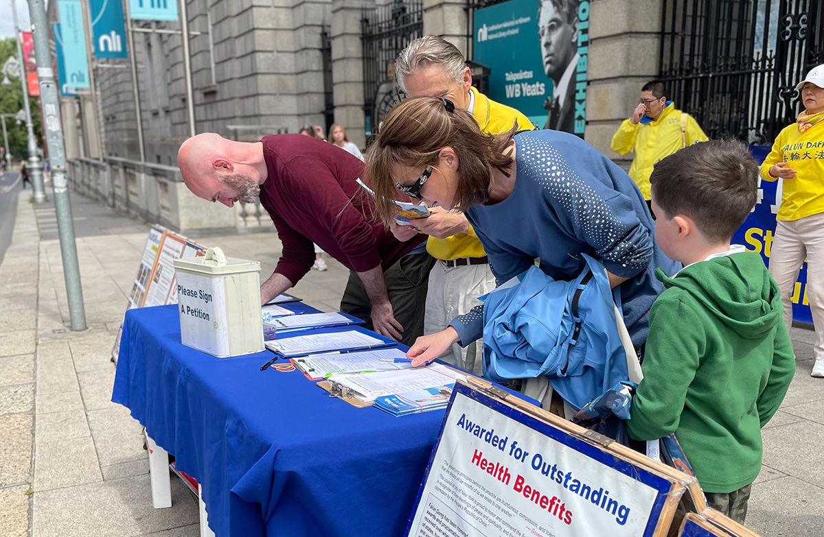 都柏林人苏珊(Susan)正准备到附近参加聚会,得知学员在征集签名,要求制止中共对法轮功的迫害后,她立即拿起笔签名,还邀请朋友也来一起签名。在与学员交谈后,她们询问是否可以多带一些真相资料走,希望聚会上的朋友都能帮助制止中共对法轮功学员的迫害。