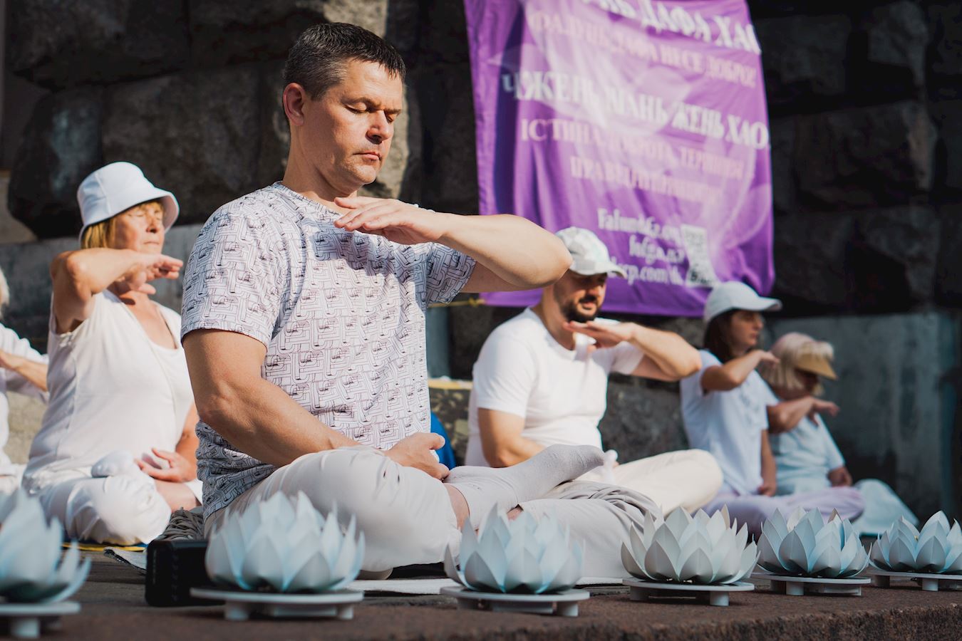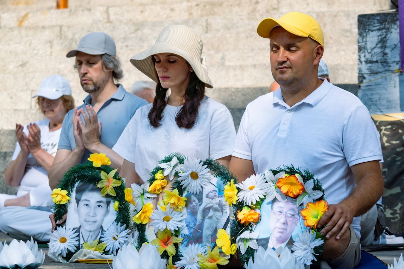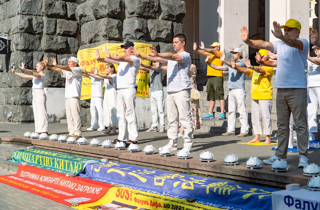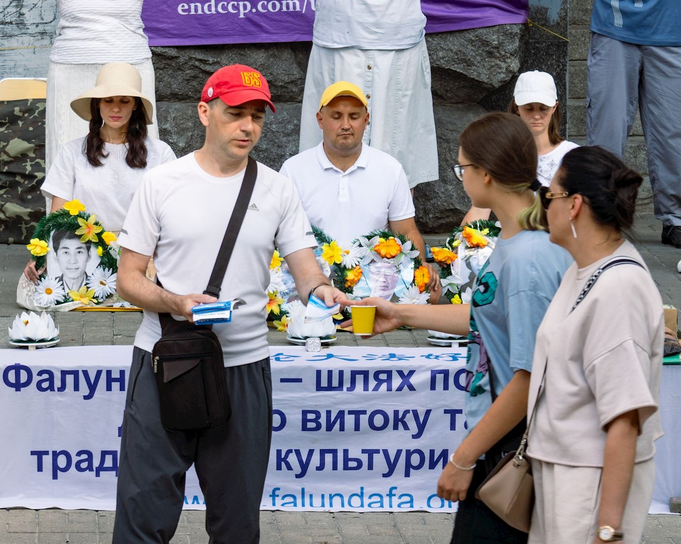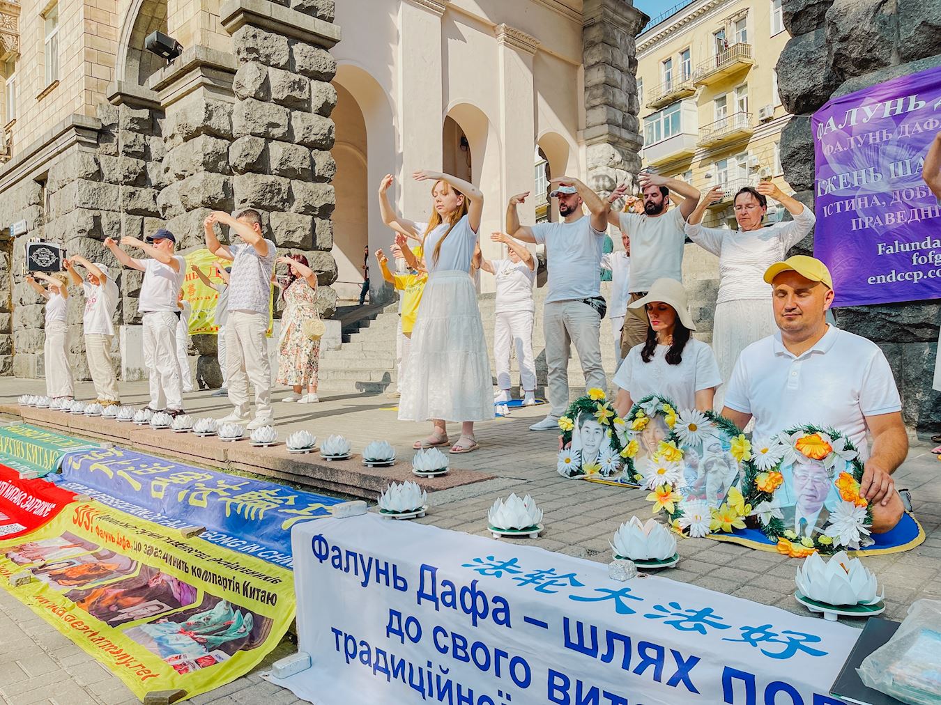 活动在著名的赫列夏街(Khreshchatyk)进行,吸引很多路人。法轮功学员举行集体炼功。几位学员盘腿而坐,手拿着遗像,悼念这些被迫害致死的中国同修们。许多路人停下来了解这次活动的内容,大多数是年轻人,有的还跟着法轮功学员学炼法轮功的功法。法轮功学员们还呼吁过往的人们在停止中共对法轮功学员迫害的请愿书上签名,许多路人也纷纷响应并签名。