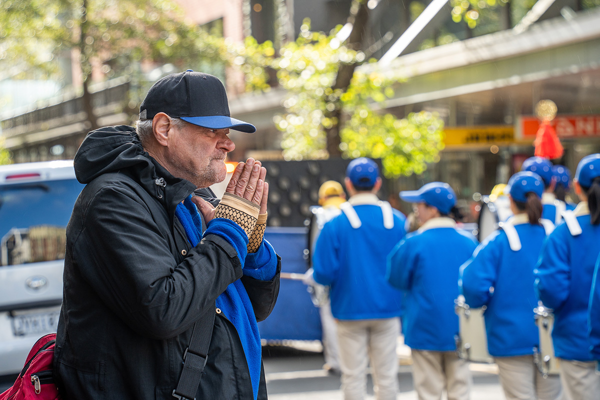 ![]() 图7:有的路人看到法轮功学员的游行队伍,双手合十。 |