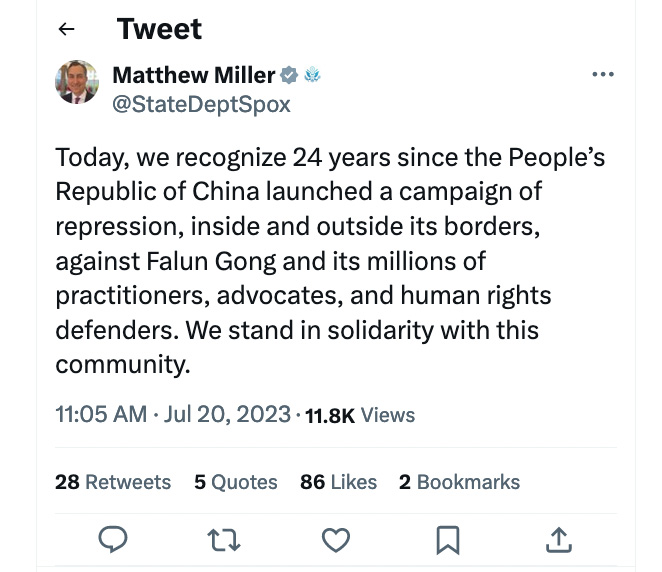 美国国务院发言人马修·米勒(Matthew Miller)七月二十日发表推文。米勒表示:“今天,我们意识到自从中国在国内外发动对法轮功以及数百万学员,倡导者和人权捍卫者的镇压运动以来,(至今)已经二十四年了。我们与这个团体团结在一起。”