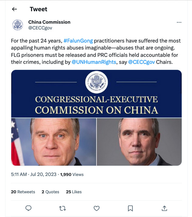 美国国会及行政当局中国委员会(简称:CECC),于二零二三年七月二十日早晨在其官方推特上也发表声明,谴责中共“最骇人听闻的人权践踏”,并敦促中共当局无条件释放所有被关押的法轮功学员。