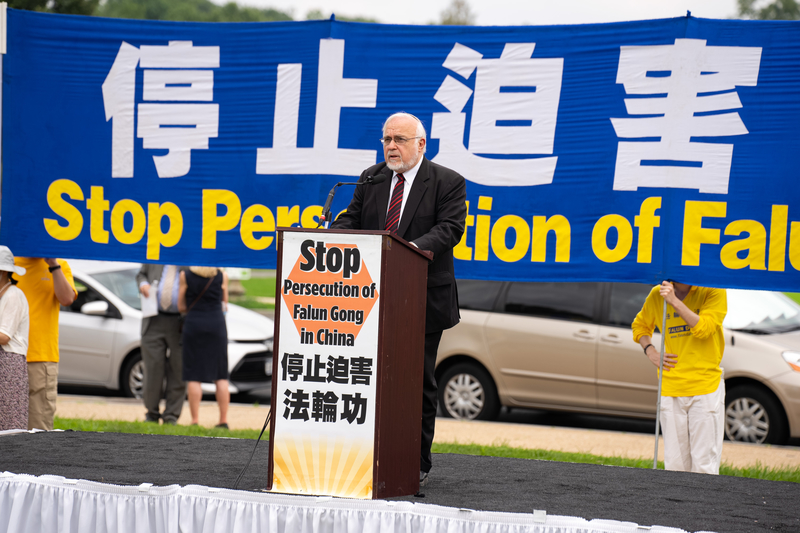 美国国际宗教自由委员会(USCIRF)主席亚伯拉罕·库珀(Abraham Cooper)在集会中谴责中共对法轮功系统、持续且异常恶劣的镇压。