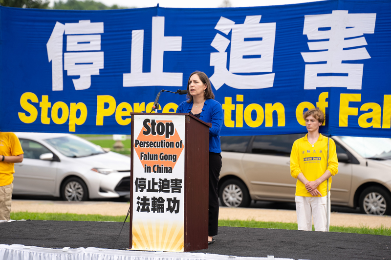 兰托斯人权和正义基金会主席卡特里娜·斯威特(Katrina Lantos Swett)来到集会现场。“站在这里看到这片黄色的海洋是多么鼓舞人心。你们美丽的横幅,最重要的是你们坚定、忠诚、善良、聪明、美妙的面孔。你们是我们每个人的灵感来源,我感谢你们,你们是有信仰的人,是非常勇敢的人,而且非常重要的是,面对令人难忍难的迫害,你们决心不屈服、不放弃,而是坚定、坚强、昂首挺胸。我们爱你们,我们钦佩你们。现在我们知道,在中国,没有任何一个群体比法轮功学员们遭受的苦难更深重。我希望我们不会年复一年地再次在这里相见,因为我们相信这种针对无辜法轮功学员的可怕犯罪行为必须结束。”