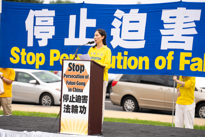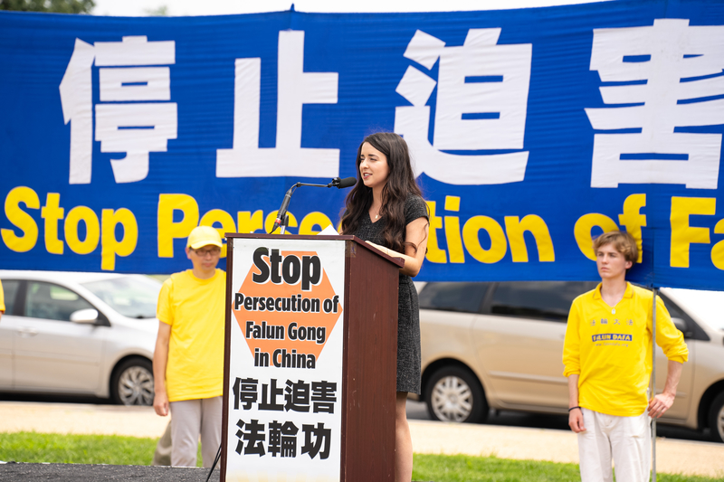 在美国首都反迫害集会的最后一位发言者是法轮功学员王珊珊。