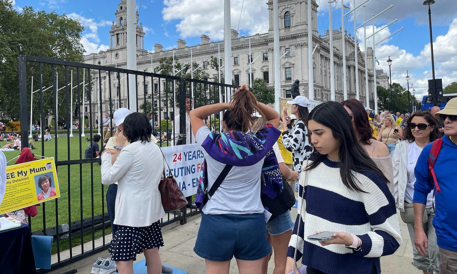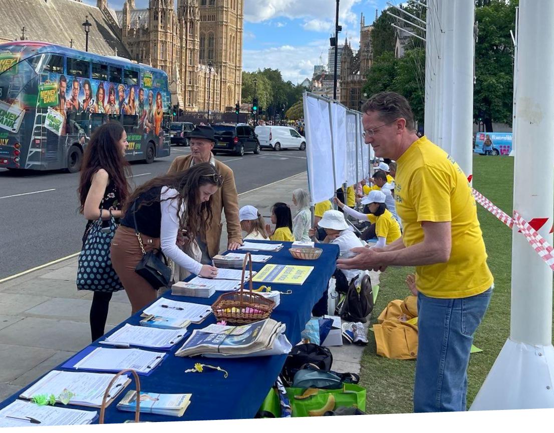 在议会大厦内举行研讨会的同时,英国部分法轮功学员在大厦外排起长长的横幅,并有法轮功学员在监狱中被酷刑折磨的模拟场景演示,向过往民众和游人讲真相,呼应着议会内的活动。