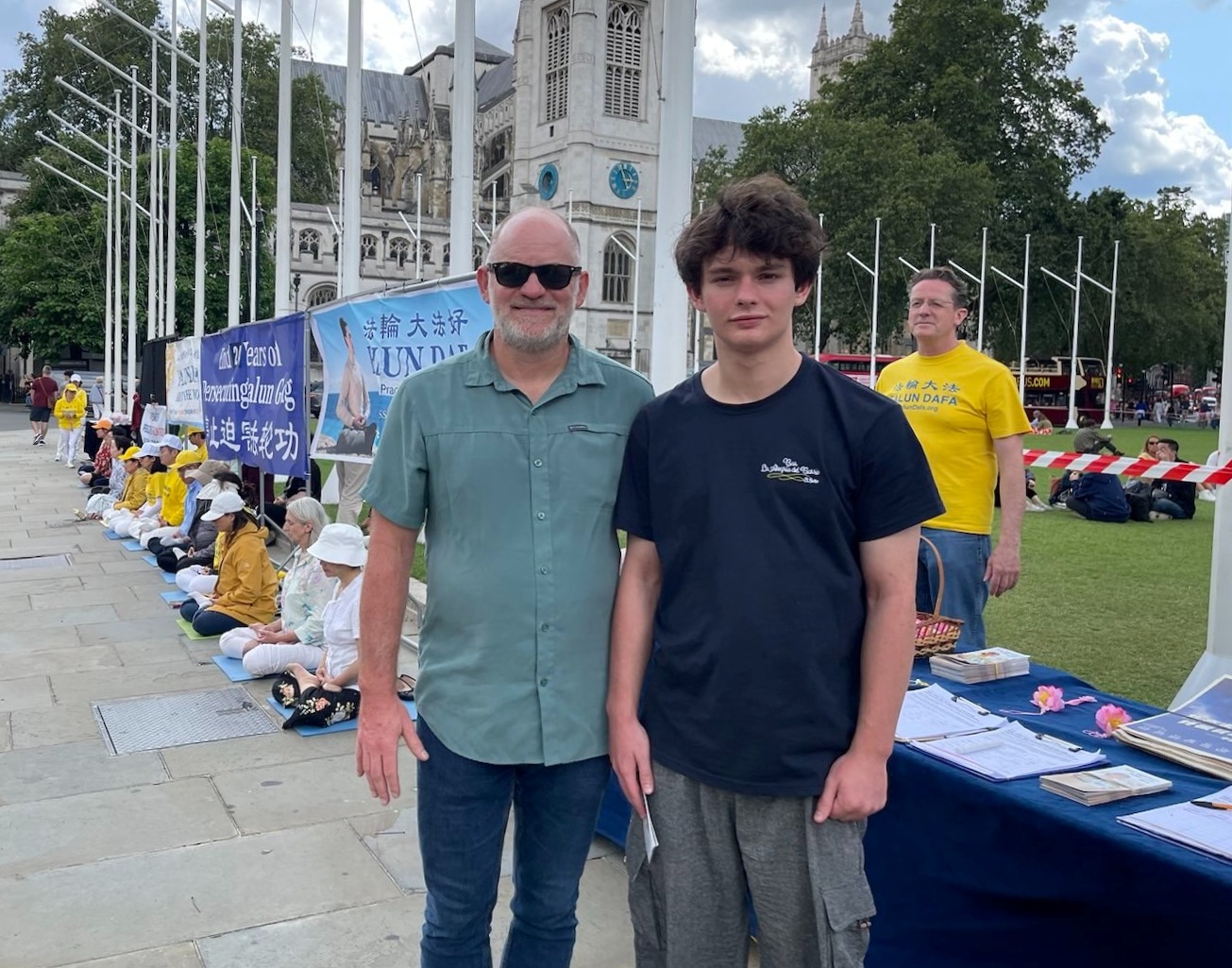 建筑工人亚伦·吕贝克(Aaron Lubeck)和儿子从美国来旅游,他们在远处看到法轮功展台。他说,“ 我很支持法轮功学员讲真相。” 他的儿子说:“我签字是支持他们正义之举,让越来越多的人知道中共的邪恶,那么全世界的国家站在一起反对中共迫害,不久中国人就会赢得自由。”他表示会帮助传播真相。