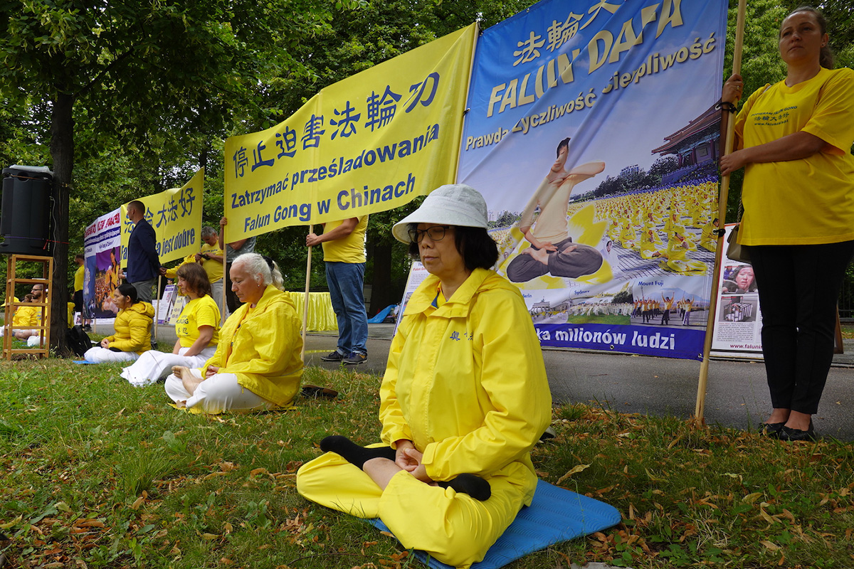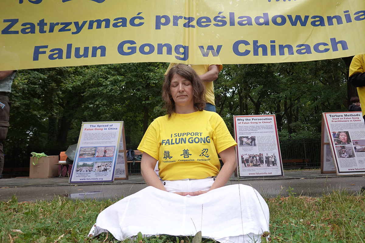 法轮功学员代表彼得(Piotr)先生在总理府前详细的介绍了法轮功(又称法轮大法)是基于真、善、忍原则的一种中国古老的修炼方法,也介绍了法轮功在中国问世后受到上亿民众喜爱的空前盛况,特别提到法轮功团体自一九九九年七月二十日以来,在中共暴力镇压下,为信仰自由进行了长达二十四年不屈不挠的抗争。