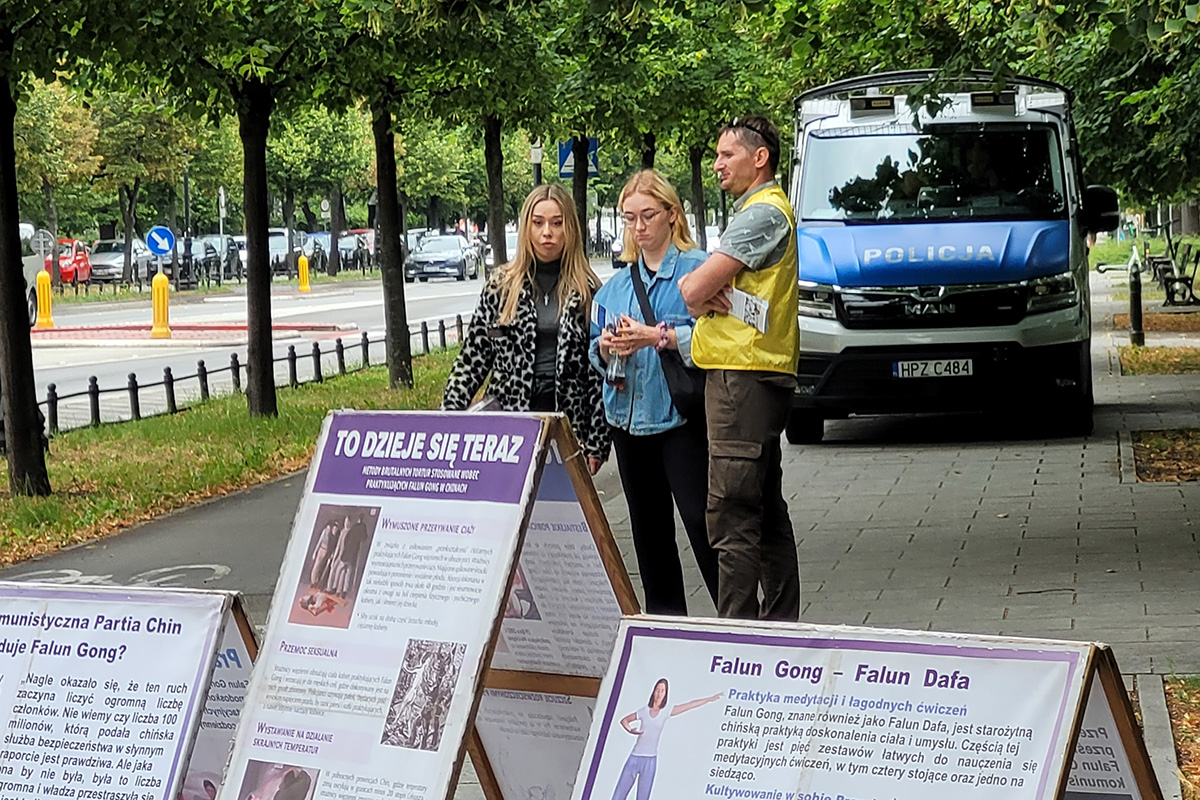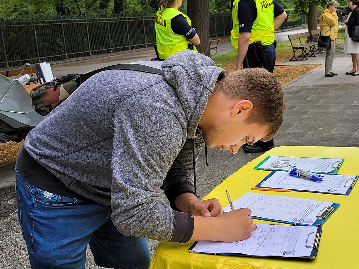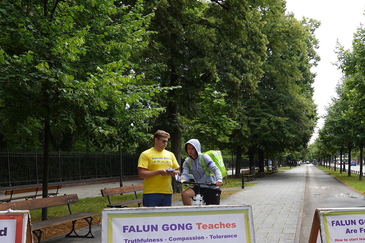 一位年轻的波兰小伙子本杰明·加温斯基(Beniamin Gawiński)站在法轮功真相展板前驻足观看,并认真倾听法轮功学员的真相介绍,最后他来到征签台前,在解体中共,支持法轮功反迫害的征签表上写下自己的名字。