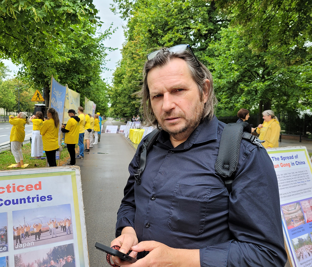 在集会现场,波兰著名电影摄影师、导演、制片人和编剧阿卡迪乌斯·戈勒比夫斯基(Arkadiusz Gołębiewski)先生刚好路过,他观看法轮功真相展板,为正在展示法轮功功法的学员们录影并仔细倾听法轮功学员的真相介绍。