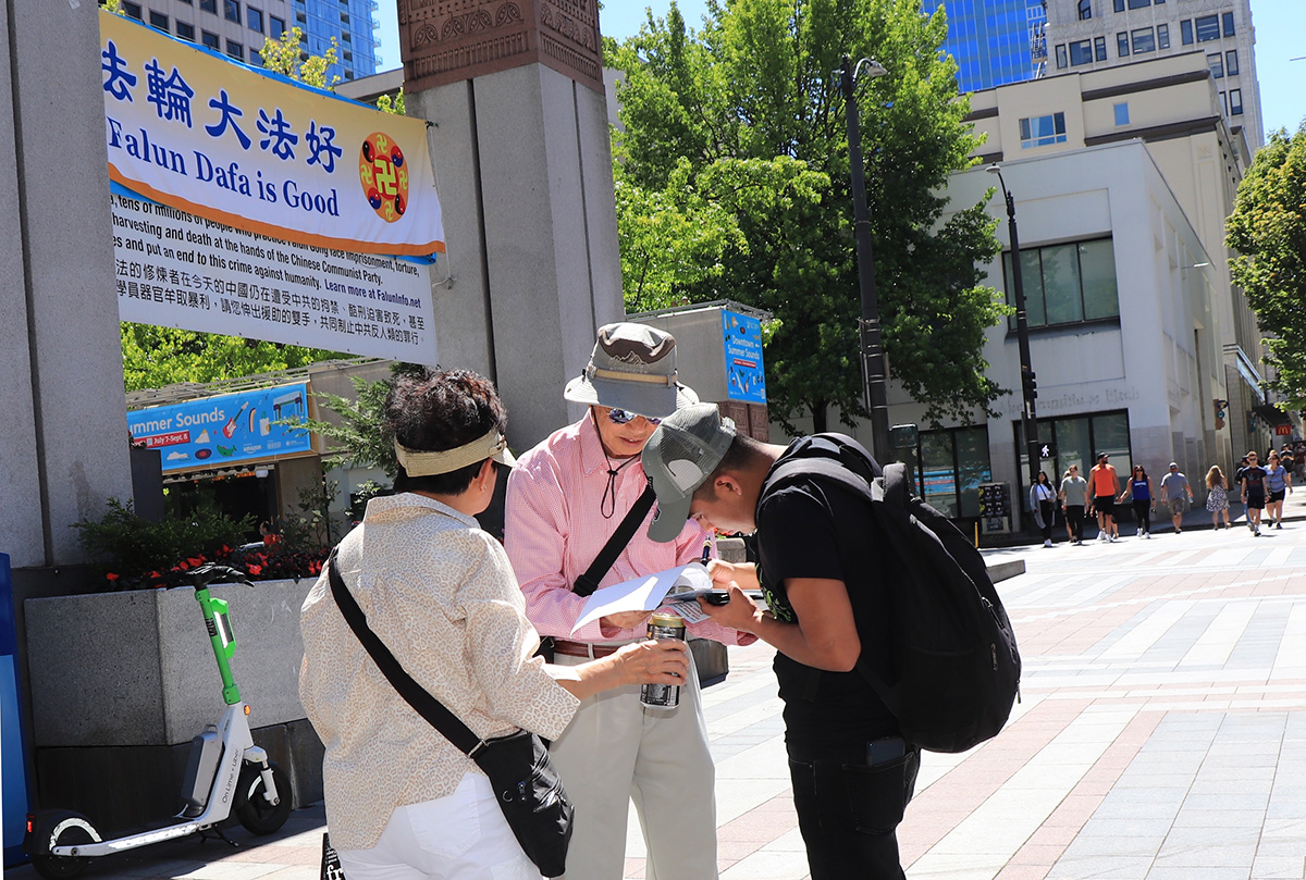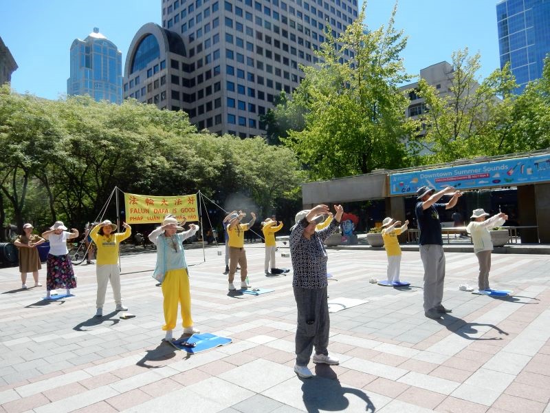 ![]() 图1:二零二三年七月十五日,反迫害24周年。西雅图部分法轮功学员在市中心举行集会。学员平静祥和的五套功法,向民众传递真相。 |