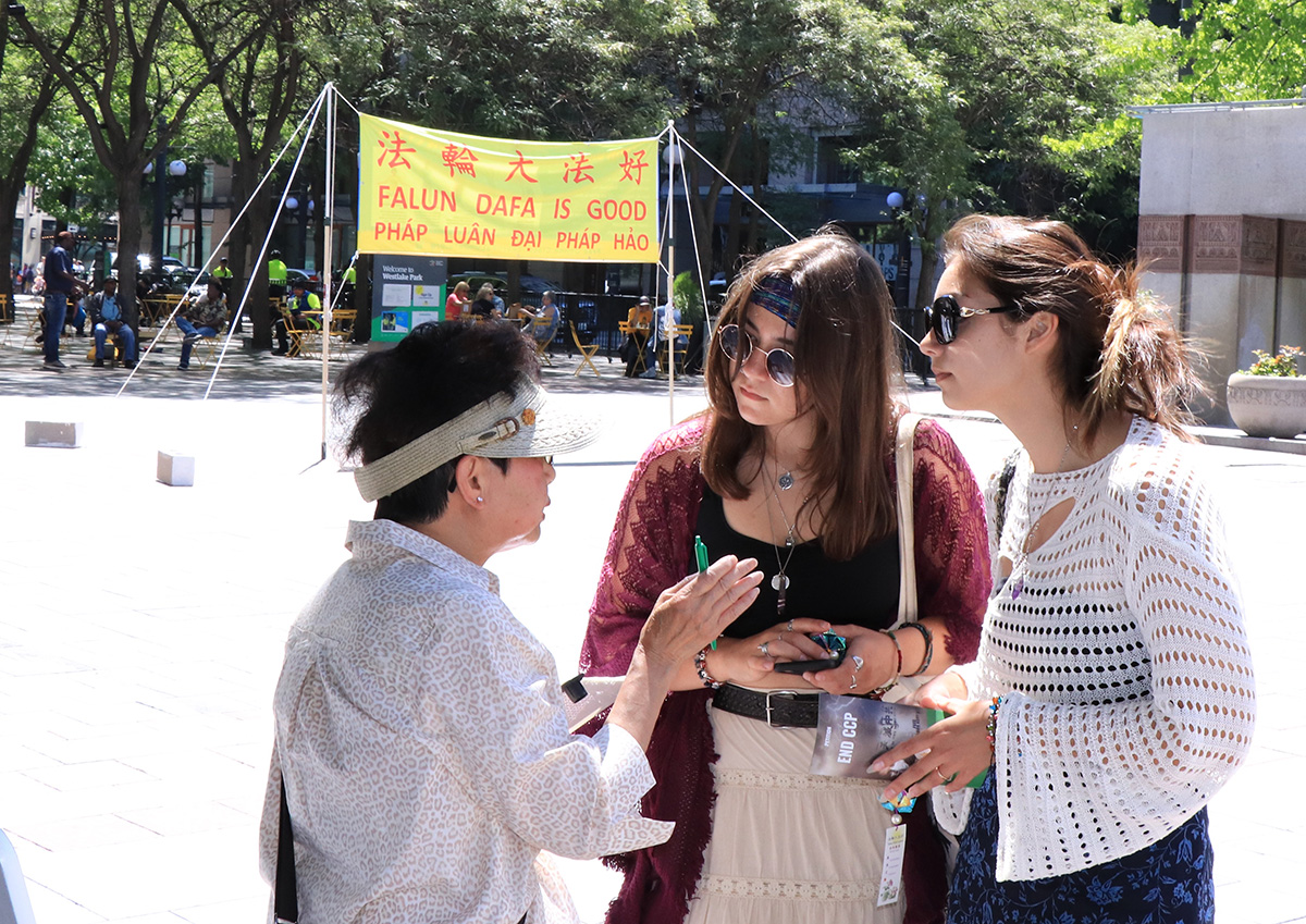 艾美(Emmy)听到法轮功学员所遭受的迫害后,表示震惊。她不能理解的是,为什么在当今社会,一个政府会做出这样残酷的迫害。当听到很多法轮功学员没有护照,不能离开中国时,她看着正在炼功的法轮功学员说:“我非常高兴你们能离开中国。”Emmy和她的儿子都对传播真相的法轮功学员表达了感谢和美好的祝愿。他们希望中共对法轮功的迫害能尽早结束。