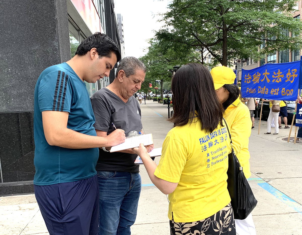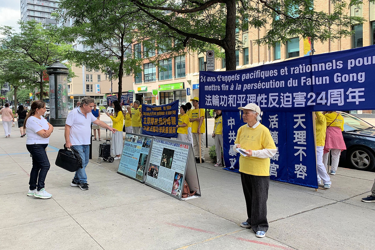![]() 图1:二零二三年七月二十日,蒙特利尔部分法轮功学员在中领馆前抗议中共持续二十四年的迫害,要求立即停止迫害。 |