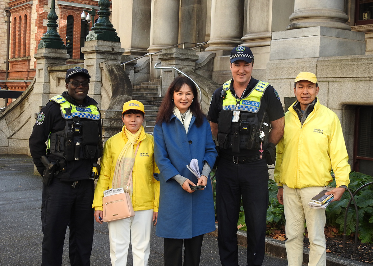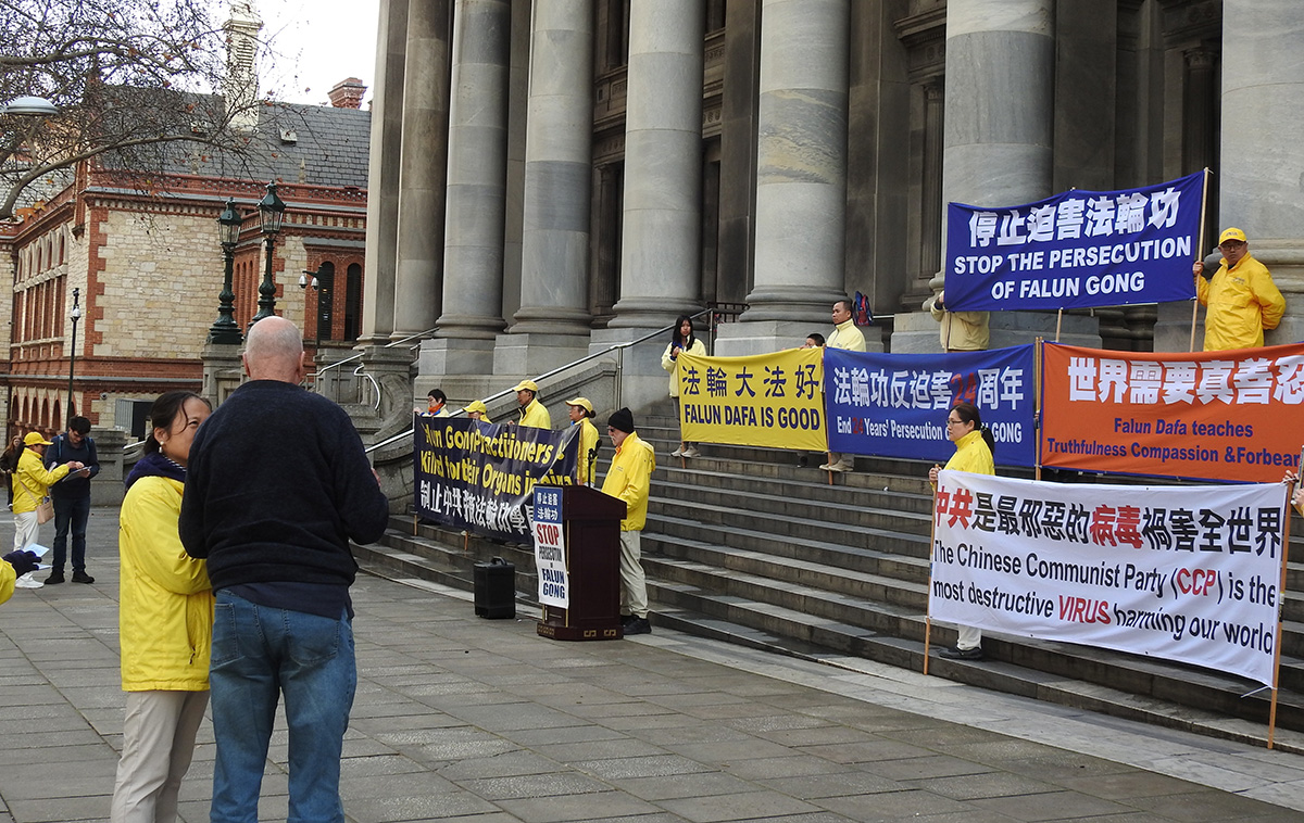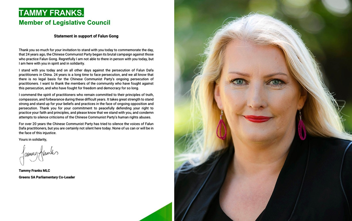 集会上宣读了南澳立法会议员弗兰克斯(Tammy Franks)的支持信,她在信中感谢法轮功学员长期坚持反迫害。她说:“我赞扬那些在迫害的磨难时期仍然坚持真、善、忍原则的修炼人的精神。面对持续的迫害,坚强地实践和捍卫信仰,需要巨大的力量。感谢你们一贯的和平坚韧反迫害,我与你们站在一起,并谴责对中共侵犯人权保持沉默的行为。在今天和其它日子,我和你们一起反对中共对法轮大法修炼者的迫害。“